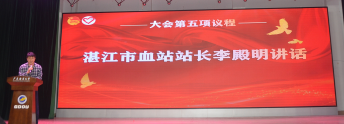 湛江市中心血站站长李殿明上台致辞,现场和大家一起分享了无偿献血志愿活动的视频,重温志愿活动短暂而快乐的时光。向学校积极参与志愿服务的广大青年学生表示感谢,向受表彰的先进集体、先进个人表示祝贺。他说,学校广大青年学子积极踊跃参与无偿献血,他看在眼里、暖在心里,喜在心头。最后祝全校师生身体健康,天天开心。