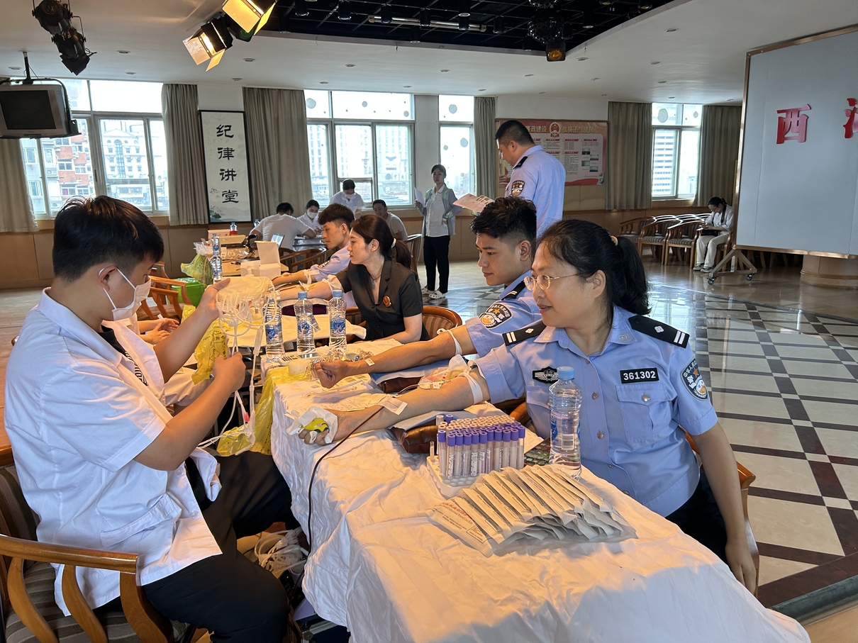 献血现场,西湖区法院的干警们在工作人员的指导下有序地填写“无偿献血登记表”,配合工作人员测量血压、化验、采血,符合献血标准的干警们依次排队进行献血。