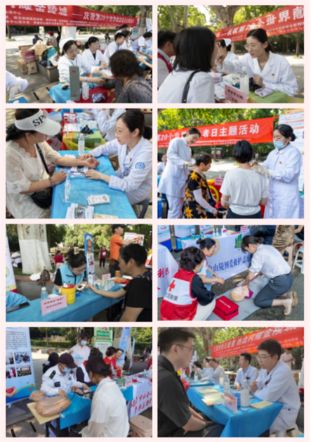 义诊现场,来自南京鼓楼医院、市第一医院、市妇幼保健院、市中医院、市口腔医院、市中西医结合医院以及市疾控中心、市急救中心的30余名青年医务工作者,以及来自博爱钟山救护志愿服务队、南京市红十字会无偿献血志愿服务工作者协会、南京医药“暖杏”志愿服务团队、南京市社会儿童福利院青年志愿者协会、南京人防应急救援志愿大队的30余名志愿者共同为广大市民提供了测血型、血压、血糖,颈肩腰腿痛、关节养护、中医护理、妇女保健、儿童保健、口腔健康等咨询服务,以及全民健康生活方式、急救知识宣传、普及心肺复苏和AED使用等科普知识宣传,吸引了大量的市民朋友。