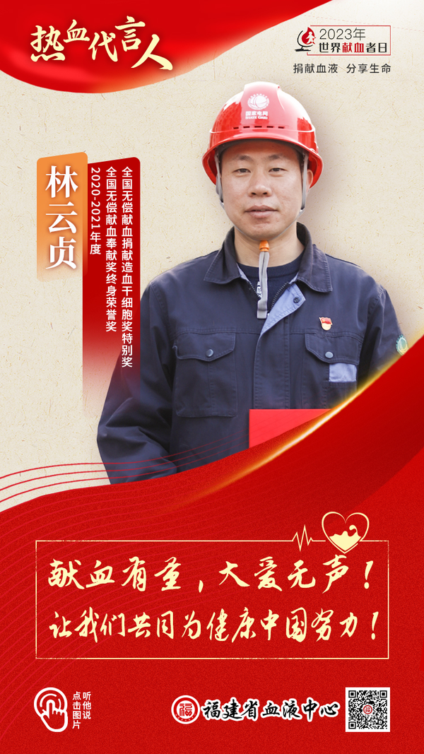 国网古田县供电公司党委书记林云贞,自1999年第一次参加献血以来,就在心里埋下了献血的“种子”,此后每年都会定期参加无偿献血,坚持二十四年,累计无偿献血77次,献血总量4.7万余,获得全国无偿献血奉献奖金奖5次、银奖1次、铜奖1次,获中国青年志愿服务铜奖,2020-2021年度全国无偿献血奉献奖终身荣誉奖、无偿捐献造血干细胞特别奖。累计志愿服务时间超过2000小时。