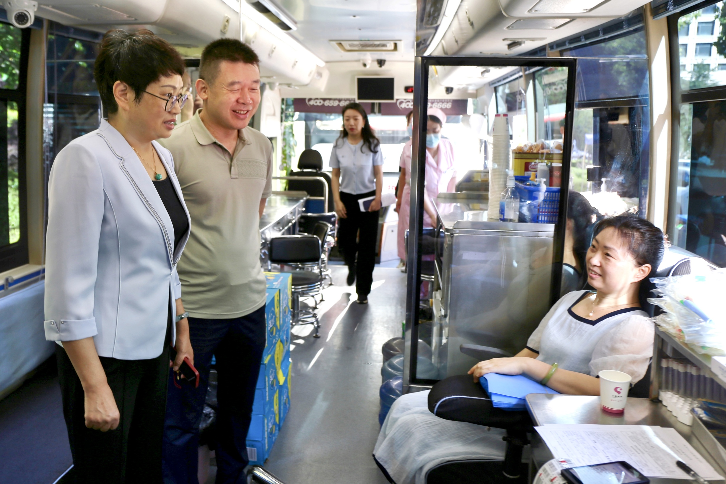 活动现场,十堰市人民政府副市长朱云慧、市卫健委党组书记、主任彭力一行来到采血现场,向采血车上正在献血的献血者表示慰问和感谢,并对市中心血站工作人员的辛勤付出表示肯定。