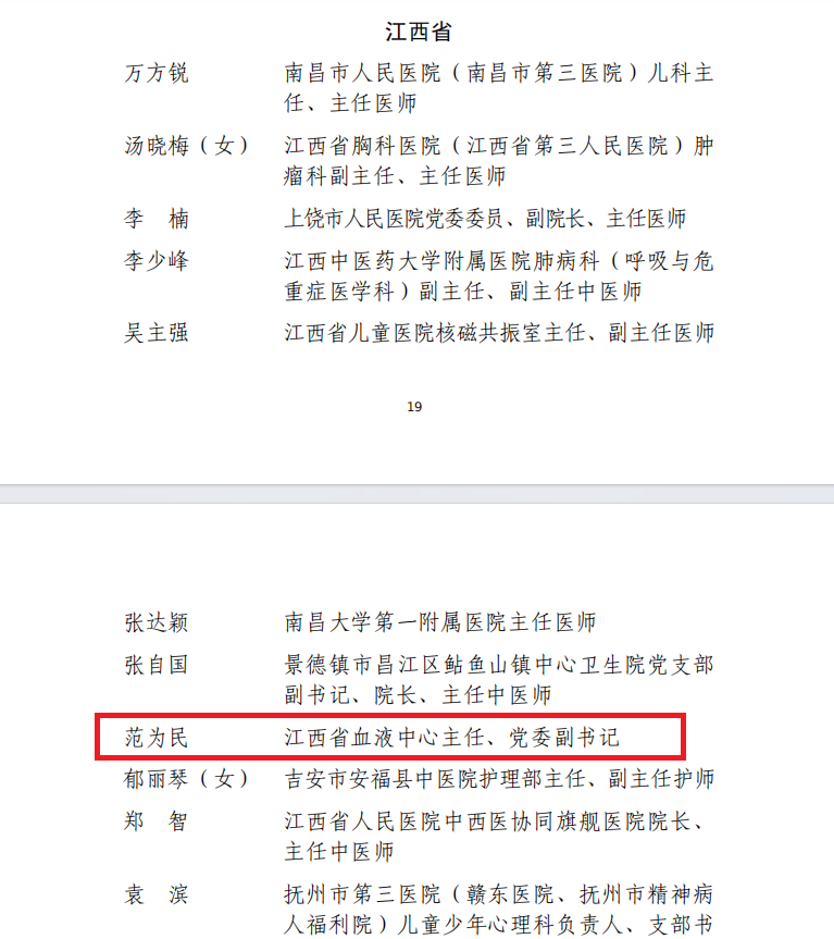 3月31日,人力资源社会保障部 国家卫生健康委 国家中医药局 国家疾控局表彰决定,授予326个单位“全国卫生健康系统先进集体”称号,749名同志“全国卫生健康系统先进工作者”称号,30名同志“‘白求恩奖章’获得者”称号。江西省血液中心主任、党委副书记范为民荣获“全国卫生健康系统先进工作者”称号。