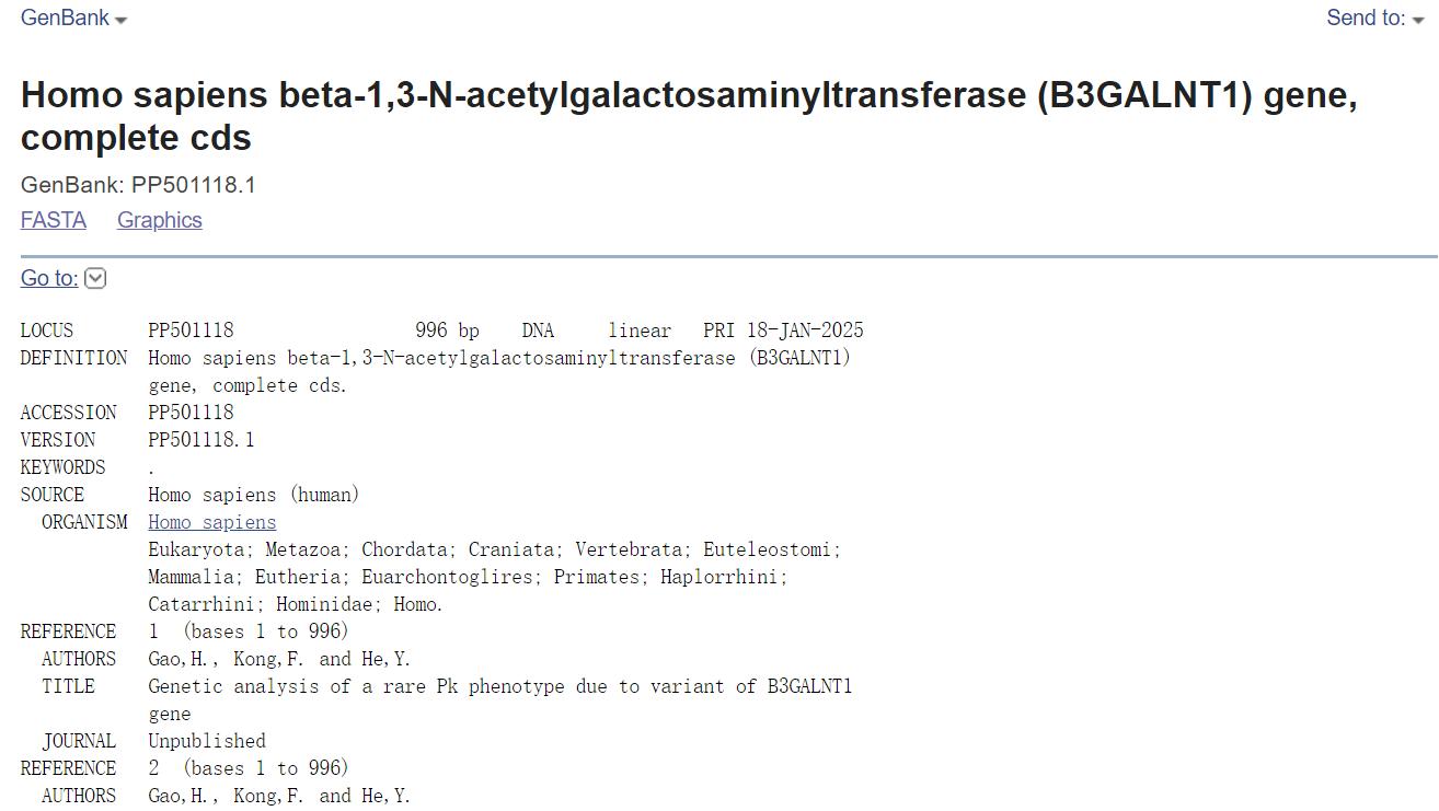 近日,济宁市中心血站检验检测部在对一名患者进行疑难血型检测时,发现了一例罕见的Pk表型。通过测序分析,确认该患者核苷酸序列存在一个新的(c.239T>A)突变位点,为全球首次发现,该序列已被“GenBank”数据库收录并发布,收录序列号为PP501118。