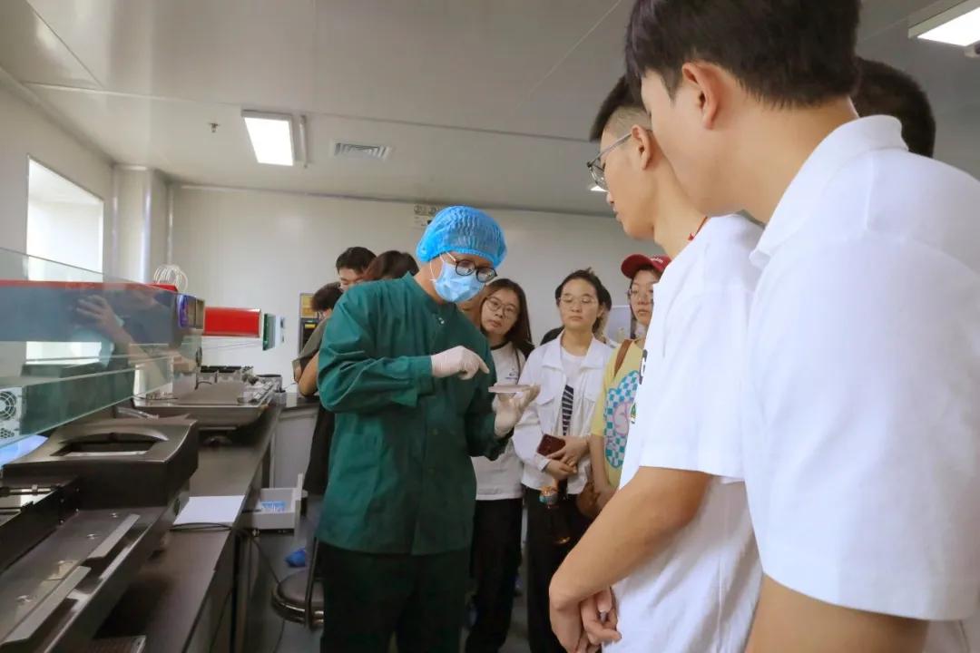 在血站工作人员的引导下,同学们先后参观了发血科、成分科、检验科和质控科。各科室负责人为同学们详细讲解了冷链储存、成分分离、血液检测等全流程操作,让同学们更直观地了解“一袋血的旅程”,深切感受每一个环节蕴含的严谨与责任。实地探访中,同学们看到血液储存区内不同规格的血液制品按温度要求分类存放,智能温控系统实时监控环境参数;成分科工作人员通过离心技术将全血分离为红细胞、血浆等不同成分,实现“一血多用”;血液检验从酶联免疫法到核酸检测技术,从样本处理到结果审核,先进检测设备的更新迭代持续推动输血安全水平提升……这些场景让同学们更深刻地认识到医工专业与生命健康的紧密联系,对医工技术在血液质量安全保障中发挥的关键作用有了更具象的认知。