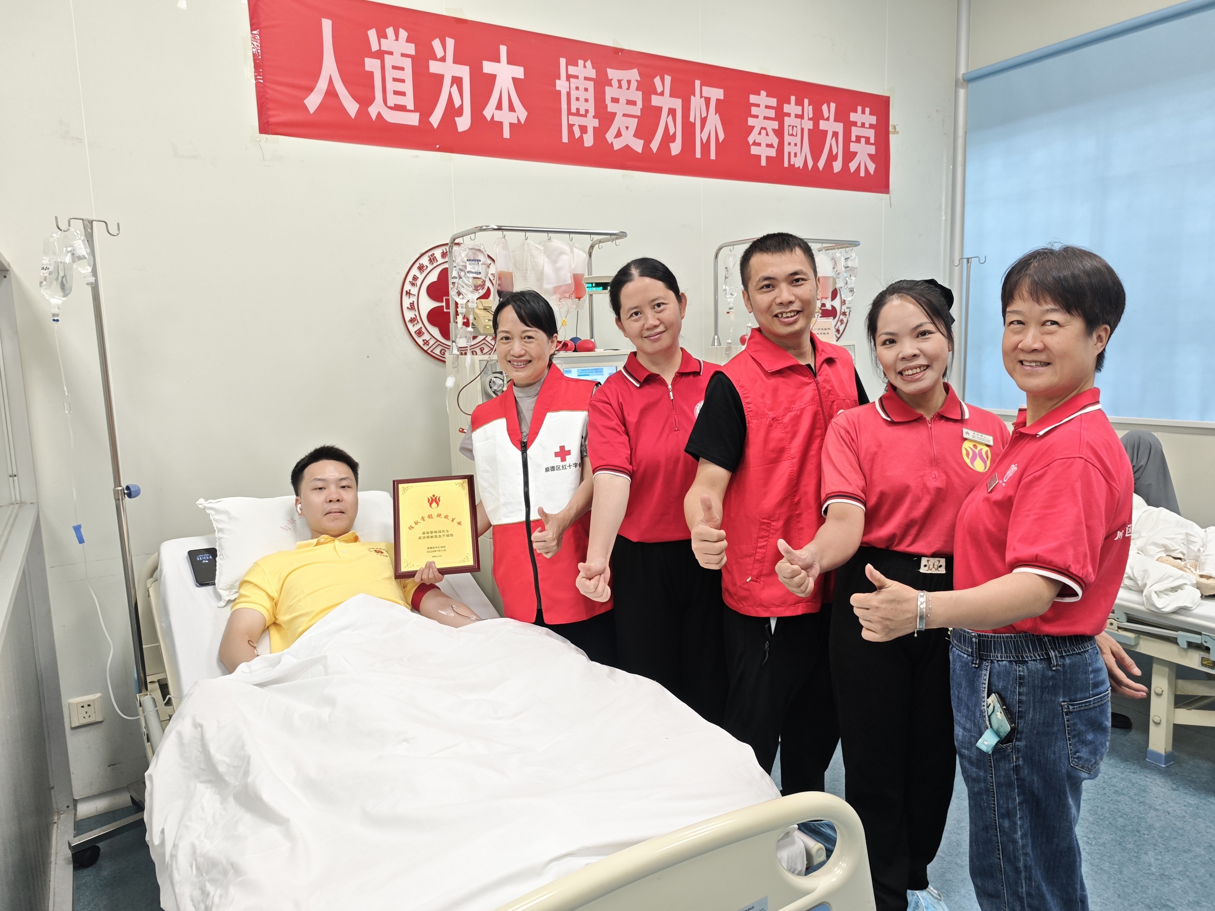 让我格外暖心的是,服务队秘书长蓉姐和血站许医生特意从顺德来到广州,专程来看望黎老师——这份跨越城市的惦念,让我真切感受到血站对捐献者的人文关怀有多暖心。还有广东分库的娟姐,从始至终都让人印象深刻,她不仅把黎老师照顾得无微不至,还总用幽默风趣的话语给我们志愿者“解压”,那份从容乐观的心态,实在让人佩服。