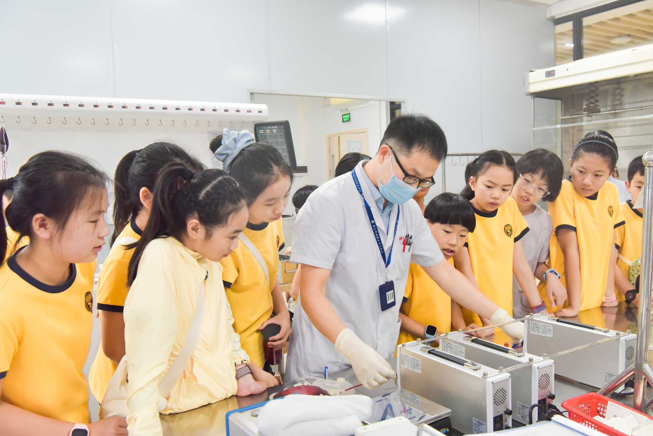 活动首站,学生们走进了血液成分制备现场。眼前,一排排离心机正高速运转,发出规律的嗡鸣,独特的场景瞬间吸引了大家的目光。