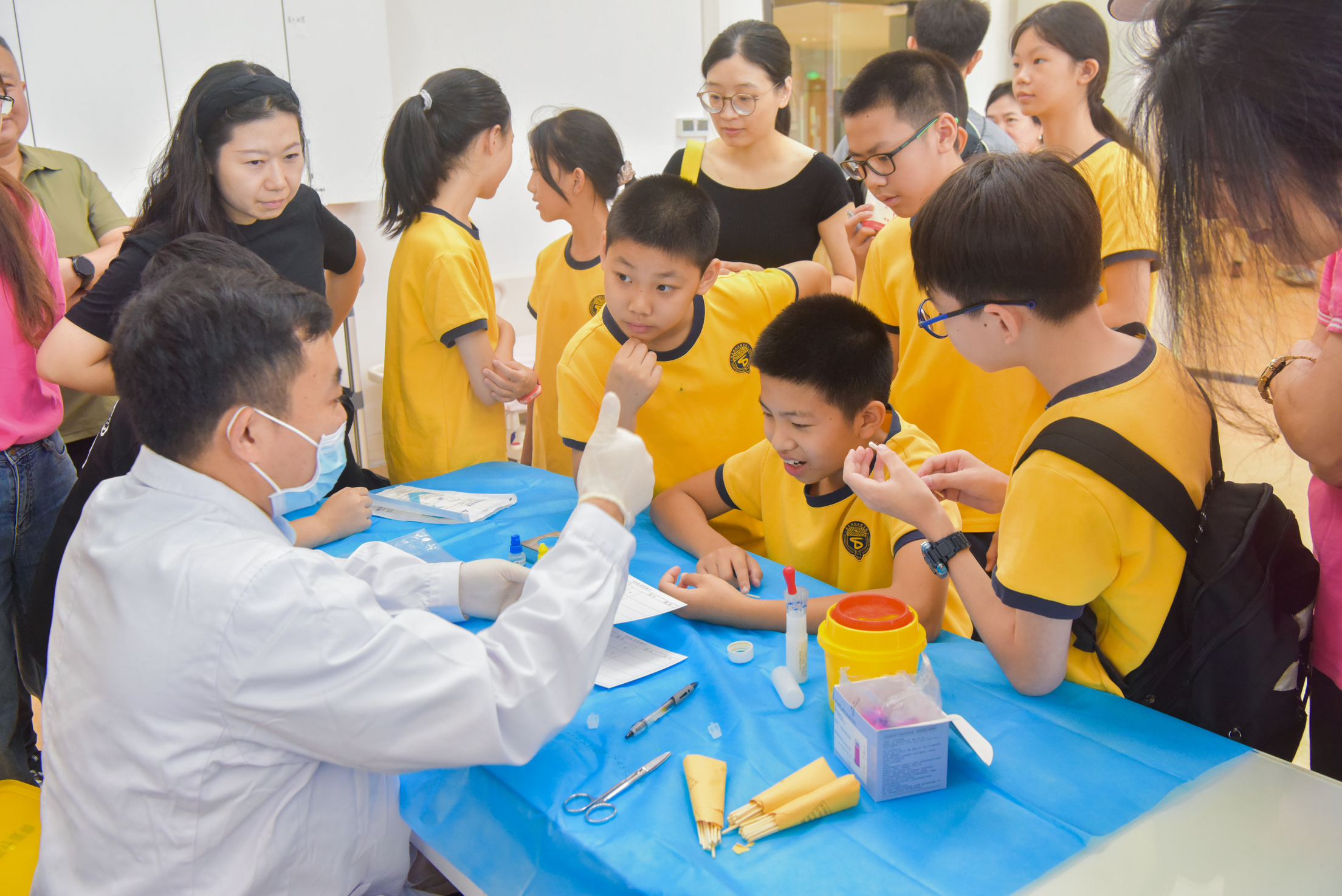 最让大家兴奋的是血型鉴定的实践操作。在血站专业人员的指导下,学生们看着纸板上的凝集反应,第一次直观地理解了自己血型的由来,了解了要使用抗A、抗B血清鉴定ABO血型。