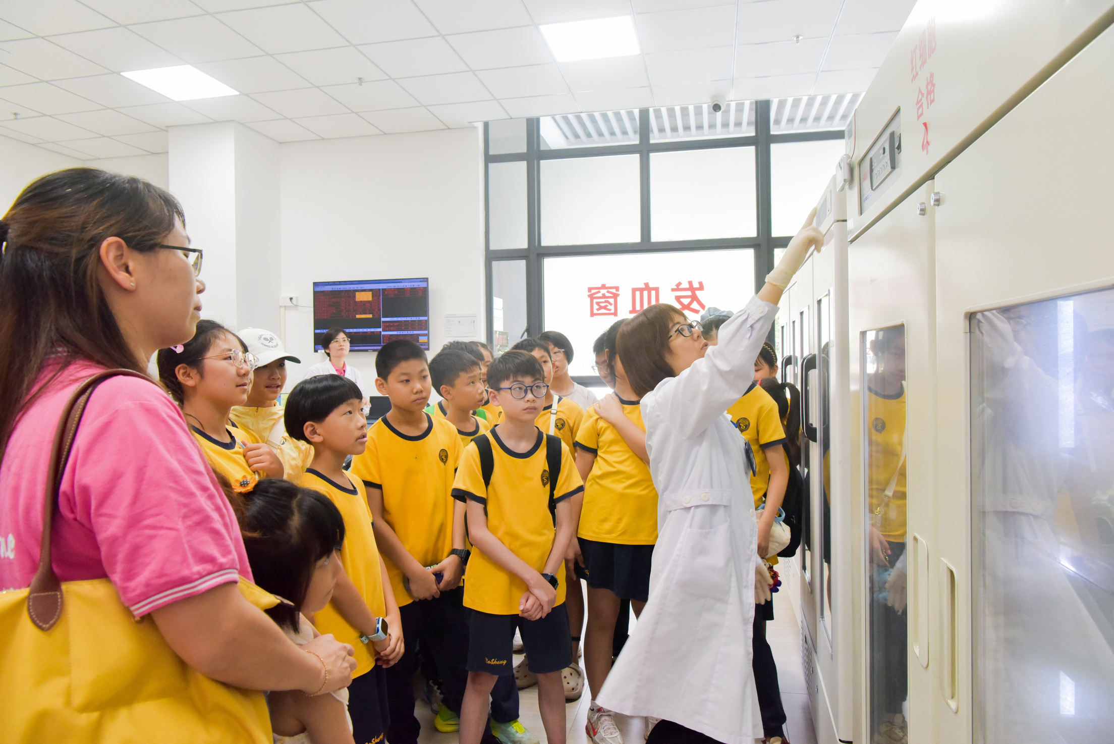 走进血库,学生们立刻被眼前的景象吸引,一排排专业储血冰箱整齐排列,不同血液成分存放在不同温度的专用设备中。