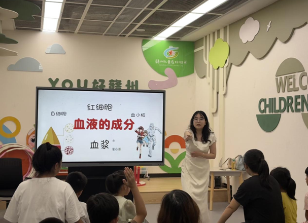 活动一开始,赣州市中心血站的工作人员秒变“科普魔法师”,用小朋友都能听懂的趣味语言,讲了“血液里藏着哪些小伙伴”“血型的神奇密码”“什么是无偿献血”这些知识。孩子们瞪着圆溜溜的好奇大眼睛,盯着工作人员的教学屏幕,完全沉浸在超酷的血液知识世界里,根本挪不开眼。