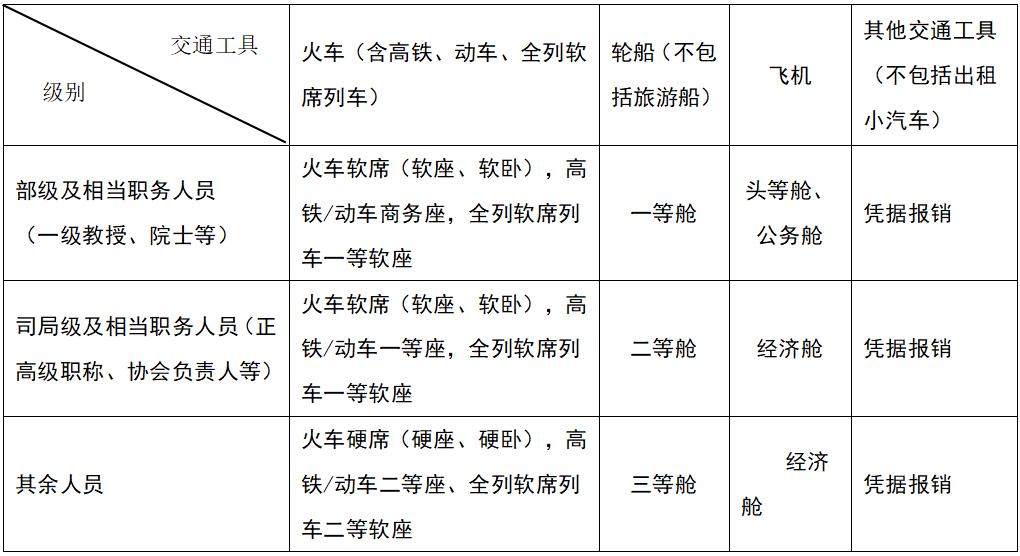 第四条 城市间交通费是指出差人员因公到常驻地以外地区出差乘坐火车、轮船、飞机等交通工具所发生的费用。出差人员乘坐城市间交通工具等级标准见下表: