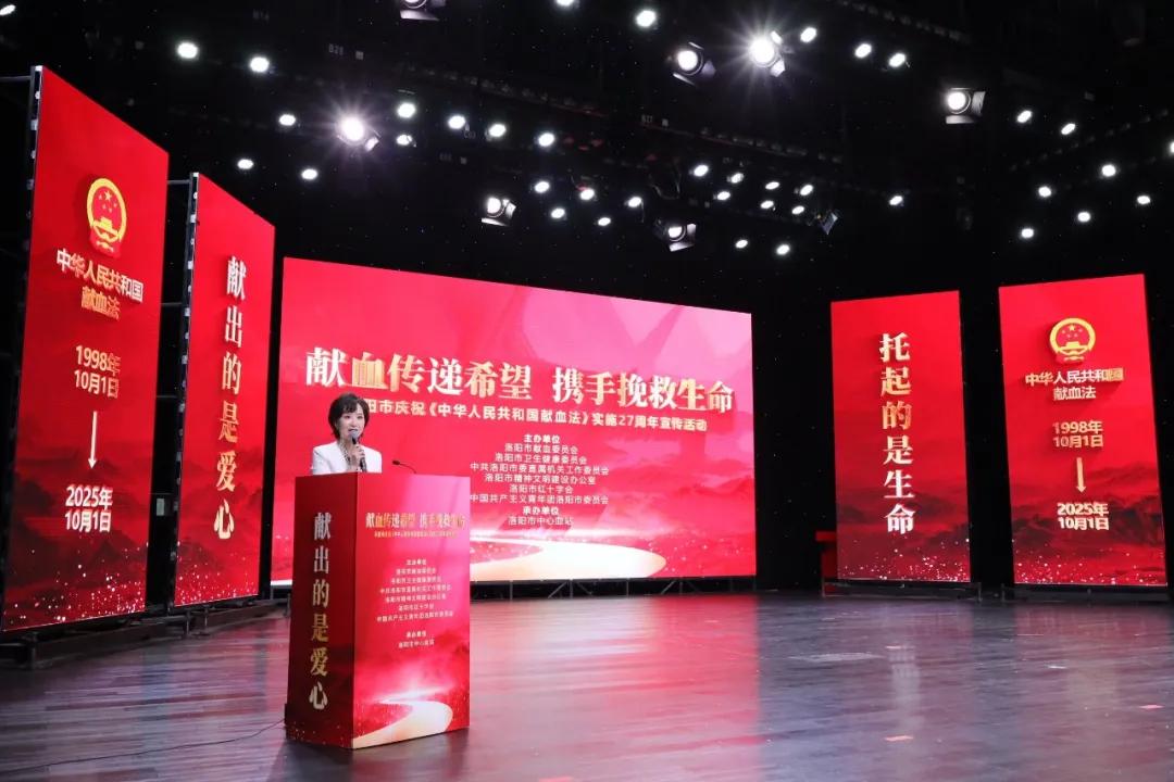 2025年9月25日下午,洛阳广播电视台二号演播厅内暖意融融、掌声阵阵,洛阳市庆祝《中华人民共和国献血法》实施27周年宣传活动在此隆重举行。活动以“献血传递希望,携手挽救生命”为主题,由市献血委员会、市卫生健康委、市委直属机关工委、市文明办、市红十字会、团市委共同主办,市中心血站承办。市领导、获奖代表、医护方阵、高校志愿者及各相关单位负责人近200人齐聚一堂,共同回顾无偿献血光辉历程,表彰先进典型,展望事业新发展。