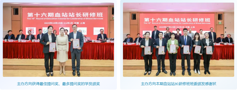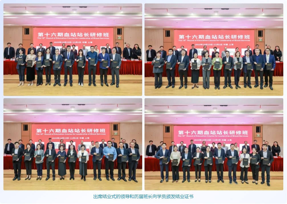2025年11月1日,第16期“血站站长研修班”在上海圆满结业。血站站长研修班自2008年举办首期课程,截至今年已经成功举办了16期,共接收学员782人,结业773人。结业的学员遍布了除港澳台之外全国31个省、市、自治区、兵团和部队血站,输血研究所。本期血站站长研修班于10月15日开班,历经18天,重点围绕“医疗科学与技术”“法律法规与标准”“单位管理”“血站业务管理”四大核心模块开设了23门课程和6门扩展课程。上海市卫生健康委员会医疗应急处副处长戴阳,中国输血协会理事长朱永明,上海市血液中心主任张晰,上海市血液中心党委书记林俊杰,2025年第十六期血站站长研修班管理委员会主任委员何涛,以及历届血站站长研修班的班长代表和国际输血协会(ISBT)执行官Jenny White出席结业式。结业式由本期血站站长研修班班长、江苏省血液中心副主任陈显主持。