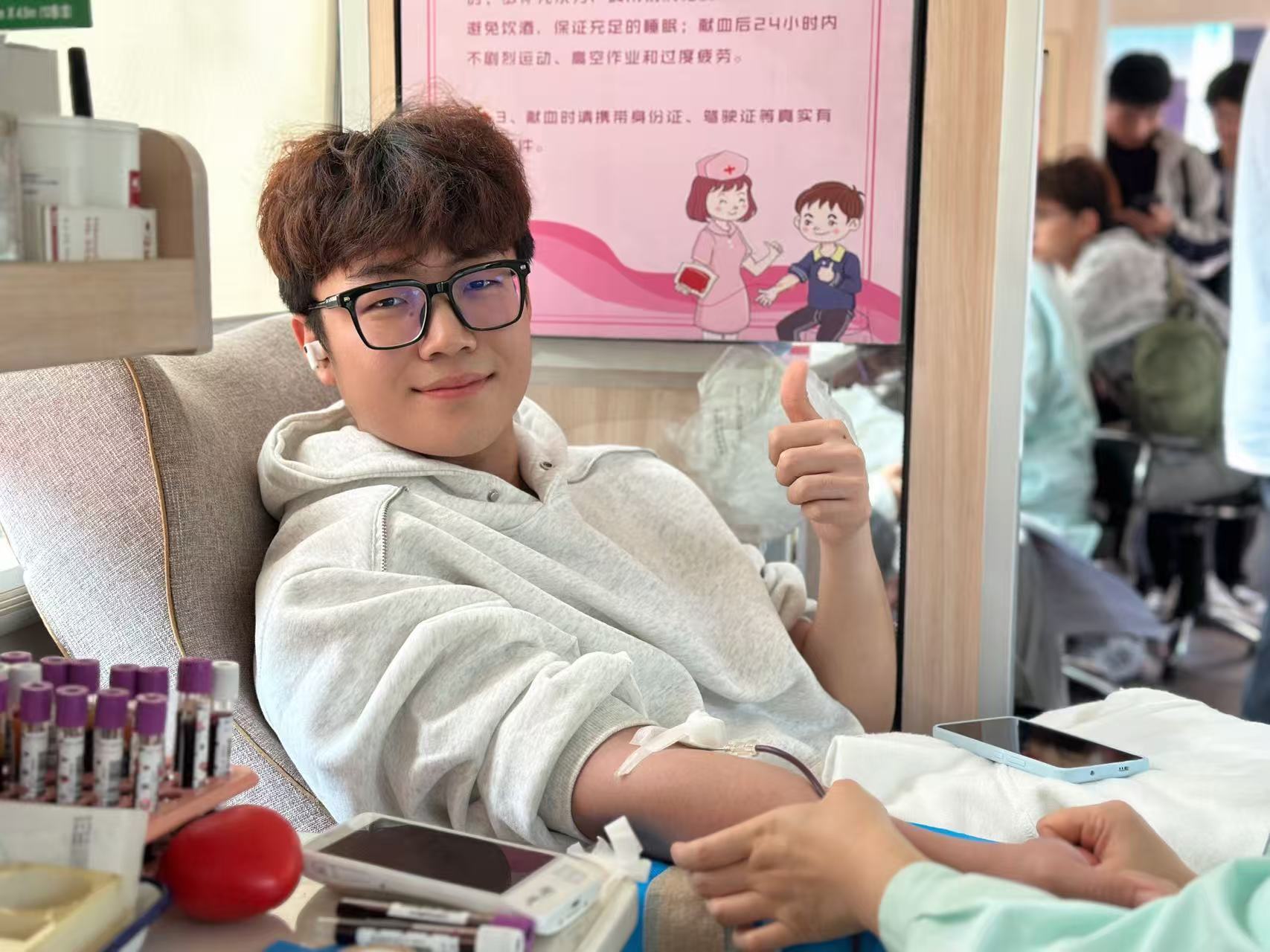现场不仅有新生的新鲜加入,还有 “资深献血者” 的身影。大三学生张焕超已经参与了 4次献血,每次献血车进校园,只要满足献血间隔期,他都会准时到场。“我从小就害怕打针,但还是愿意通过献血奉献爱心,这点困难我能克服。” 他说,就算将来毕业离开校园,也会继续坚持献血,帮助更多有需要的人,同时希望用自己的行动带动更多同学、师弟师妹参与进来。