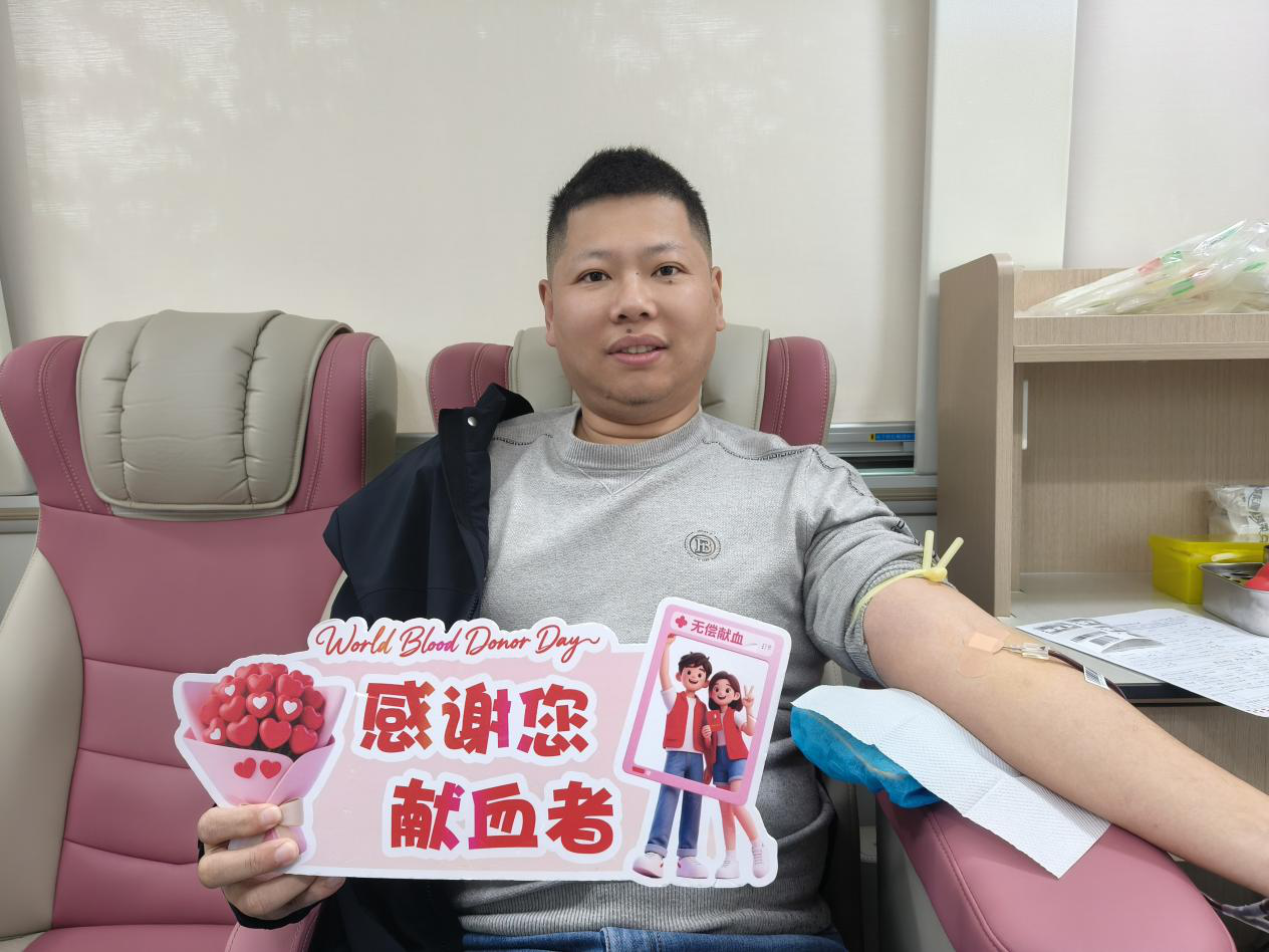 校团委宣传部长孙安康便是其中的一员,作为校园无偿献血活动的组织者,孙安康老师始终用热忱与坚守推动这份爱心事业。多年来,他不仅负责统筹协调献血车进校园、动员师生参与,更连续多年亲赴现场助力。此次,他特意利用工作间隙,以献血者身份伸出手臂——从"幕后组织者”到“台前奉献者”,用实际行动为师生树立了的榜样。