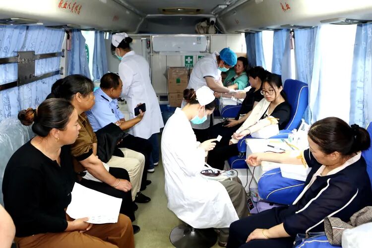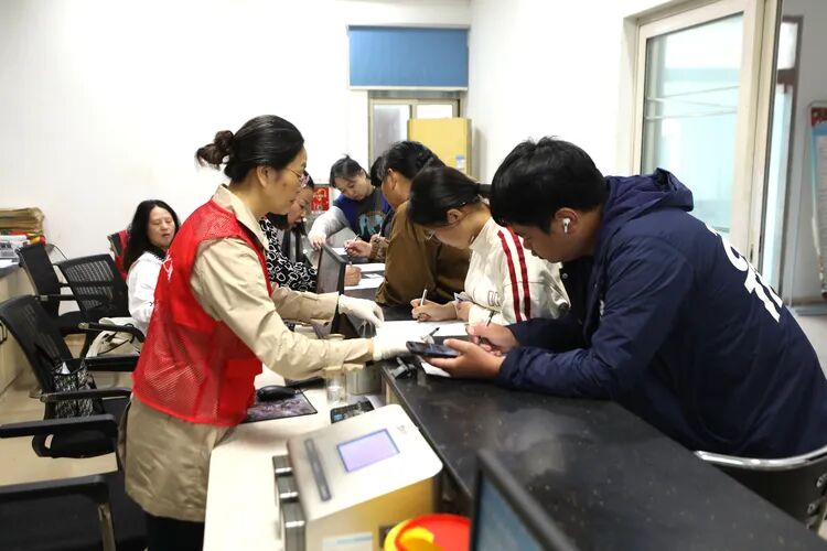 参与献血的干群自觉排队,在工作人员的指引下有序完成信息登记、征询体检