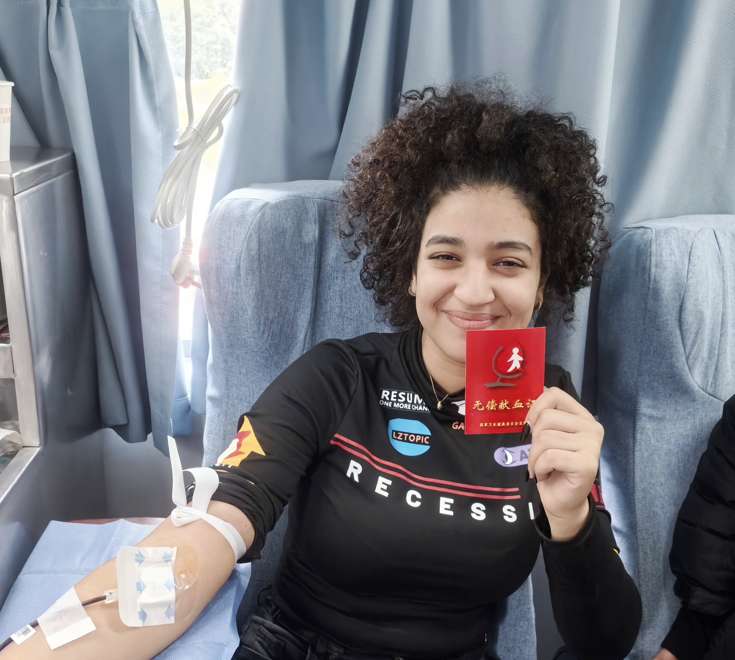 同样兴奋的还有摩洛哥姑娘Ouim和Doha,这是她们第一次参与无偿献血。看着血液缓缓流入血袋,两人不时互相拍照记录,眼中满是新奇与自豪。“之前在国内没机会尝试,这次在中国体验到了,感觉自己做了一件很有价值的事。”