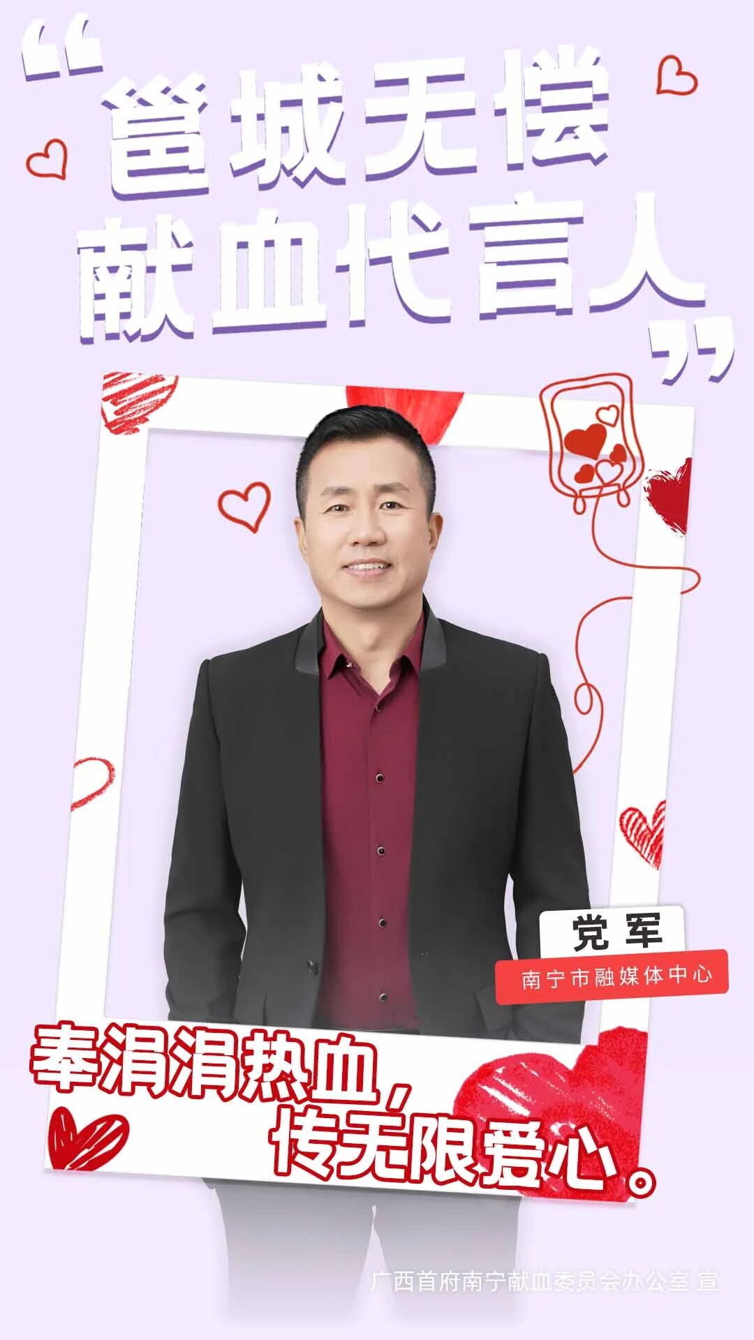 “凡是无偿献血的事,我都无条件支持!”作为一名资深新闻人,党军深知自己更应该做无偿献血公益理念的传播者。2012年,南宁中心血站邀请电视台主持人担任无偿献血形象宣传大使,党军毫不犹豫地接下任务。从日常新闻播报、世界献血者日主题晚会主持到无偿献血公益短片配音,他总是活跃在无偿献血公益发声的最前线,用新闻人特有的感染力,将献血救人的理念传递给千家万户。