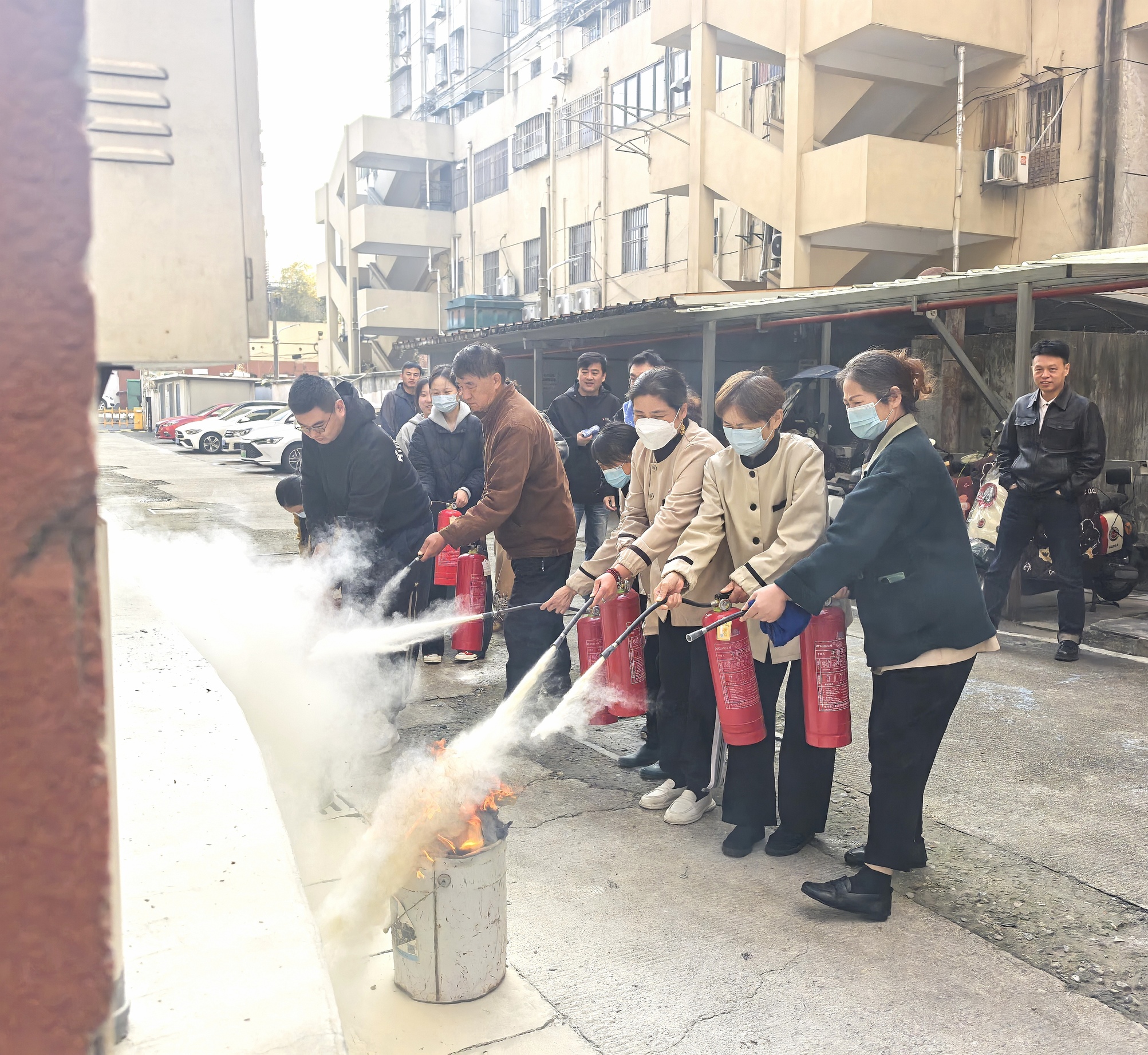 理论学习后,实战演练同步开展。在楼道区域模拟火灾场景中,参训人员在专业指导下,严格遵循消防应急预案,捂住口鼻、弯腰低姿,迅速且有序地完成应急疏散。疏散至一楼安全区域后,大家又参与了灭火实操演练,亲手操作灭火器掌握灭火技巧,将理论知识转化为实战能力。