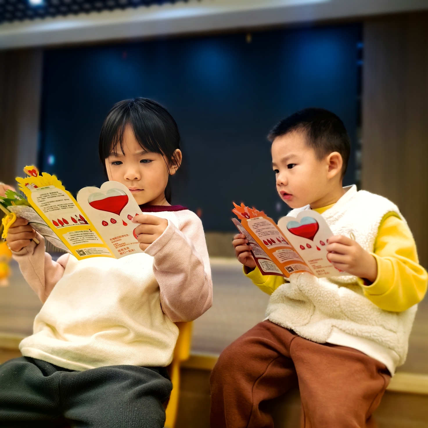 活动现场,血站宣讲员摒弃传统说教模式,通过卡通动画短片、趣味问答、互动游戏等形式,将抽象的献血知识转化为孩子们易懂的语言。“血液里有哪些小伙伴?”“为什么献血能帮助别人?”“献血对身体有害吗?”面对孩子们充满好奇的提问,宣讲员用生动的比喻一一解答,还通过“血型蹲游戏”让孩子们认识血型,引导孩子们认识不同血型,了解血液在人体中的重要作用,消除对血液的陌生感,更有孩子拿起无偿献血宣传册认真看了起来,孩子们坐姿端正、眼神专注,小手指着画册上的卡通献血者、爱心图案,时而轻声交流,时而露出纯真笑容,那份对公益的好奇与向往,成为冬日里最治愈的风景。