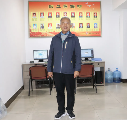 这是工程师刘志刚第14次参加无偿献血,他还在柬埔寨、印度尼西亚等国家参加过无偿献血,展示咸阳人的大爱形象。