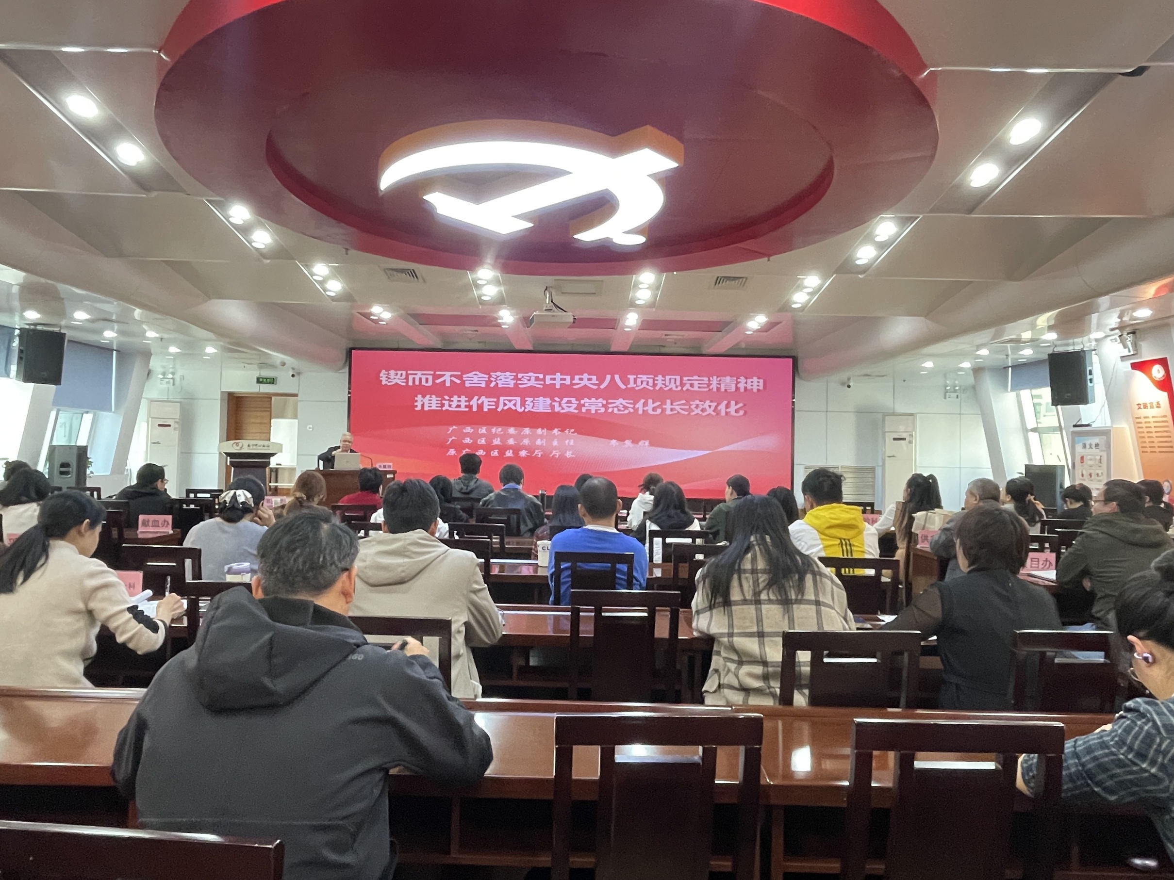 本次培训特别邀请自治区纪委原副书记、自治区监委原副主任、自治区原监察厅厅长、广西区党委组织部特聘教授韦翼群同志授课。韦教授以“锲而不舍落实中央八项规定精神 推进作风建设常态化长效化”为主题,为参训人员带来了一场内容翔实、思想深刻的专题讲座。