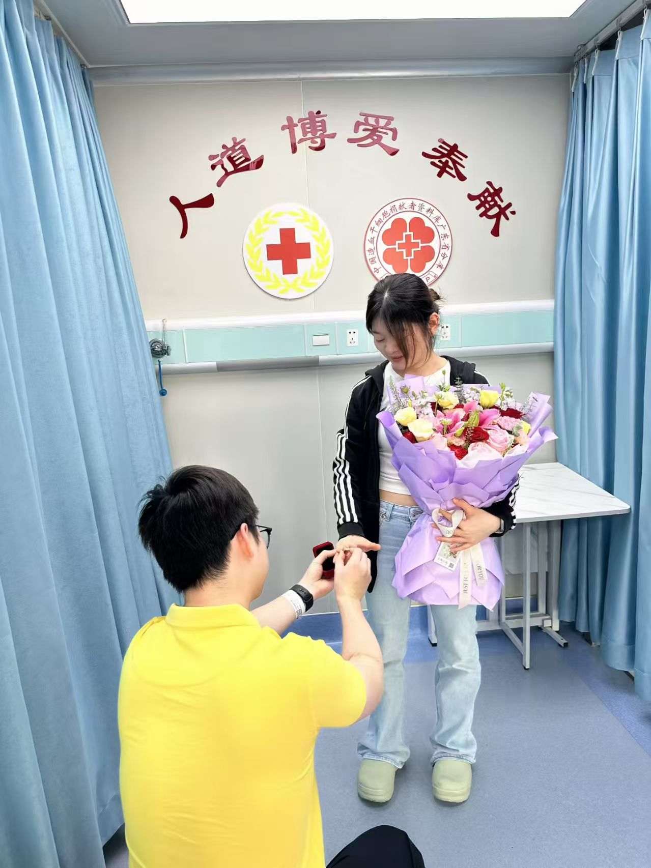 突如其来的惊喜,让他的女友感动不已。在医护人员和红十字会工作人员的祝福声中,她微笑着伸出了手,坚定地回答:“我愿意!”这一刻,救死扶伤的医者仁心与相濡以沫的私人爱意完美交融。他送出的“生命礼物”已踏上旅程,而他也收获了属于自己的甜蜜幸福。