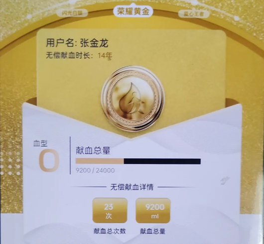 青春在奉献中闪光。三十而立的张金龙已经23次献血9200毫升,先后荣获了全国无偿献血奉献奖铜奖、银奖和金奖。