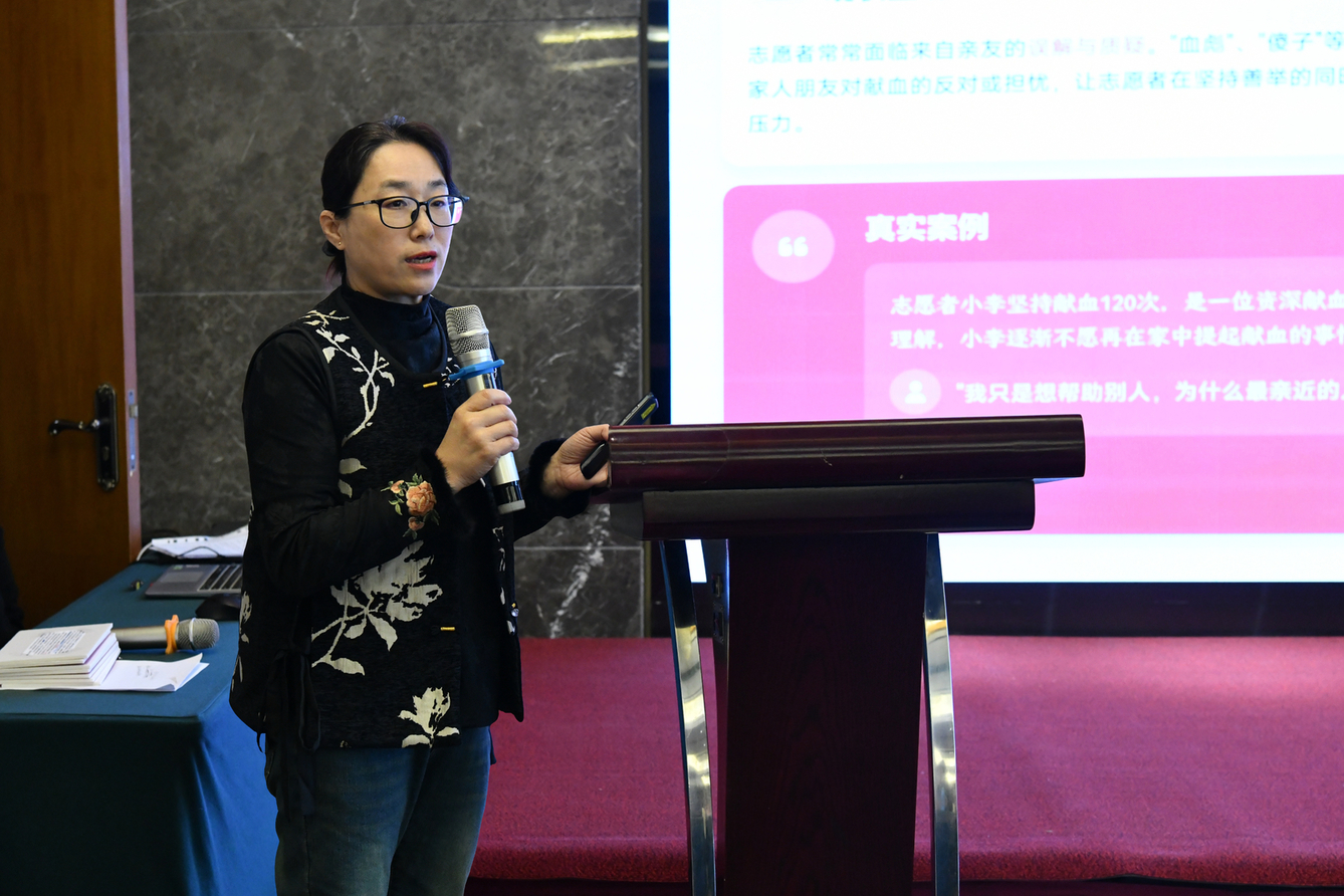 在典型事迹分享环节,一个个感人至深的故事传递着公益路上的坚守与温情。郭希龙以《献血书写大爱,服务矢志不移》为题,深情讲述了献血达人谭锡博队长的公益历程 --累计献血总量达15万多毫升,创下连续69个月每月捐献2个治疗量血小板的纪录,即便丈夫突发重病仍坚守志愿服务岗位,用行动诠释“一切献给党”的赤诚。