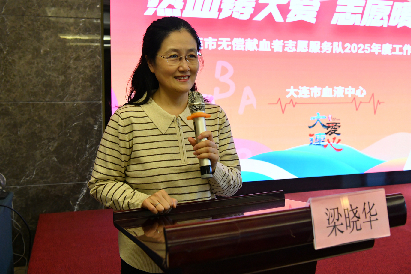 大连市血液中心主任梁晓华在总结讲话中,对服务队 2025 年的工作成果给予高度肯定。她表示志愿者们用一次次挽袖伸臂、一句句耐心讲解,为临床用血提供了坚实保障,成为滨城最亮丽的文明风景线。她强调,2026年作为“十五五”开局之年,希望服务队继续弘扬志愿精神,创新融合共建模式,加强科学管理,推动无偿献血事业可持续发展。梁晓华主任特别向谭锡博队长及全体志愿者致以敬意,感谢他们舍小家为大家的无私付出,呼吁全社会共同关注支持无偿献血事业。