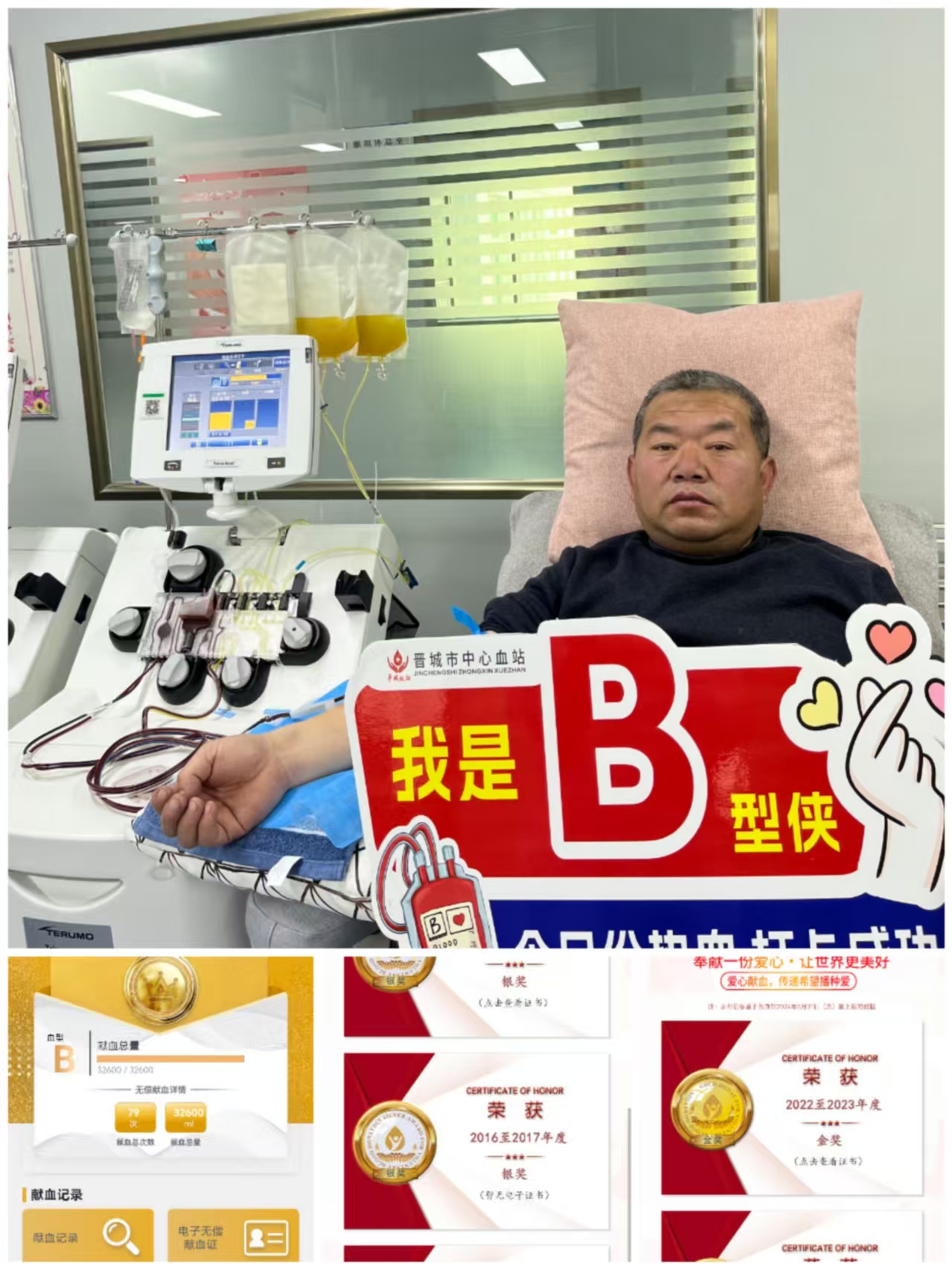 从沁水县永红煤矿到市中心血站,往返约60公里。这条“热血专线”,赵小军每月就要奔波一次。没有便捷的直达车,他需要早早出发,辗转班车,遇到过风雪阻路,也经历过炎夏酷暑,但预约好的时间,他几乎从未爽约。“和等着血液救治的患者相比,我这不算啥。”在他家中,一张张献血证和两张“全国无偿献血奉献奖金奖”证书,无声见证了这24年的热血坚守。
