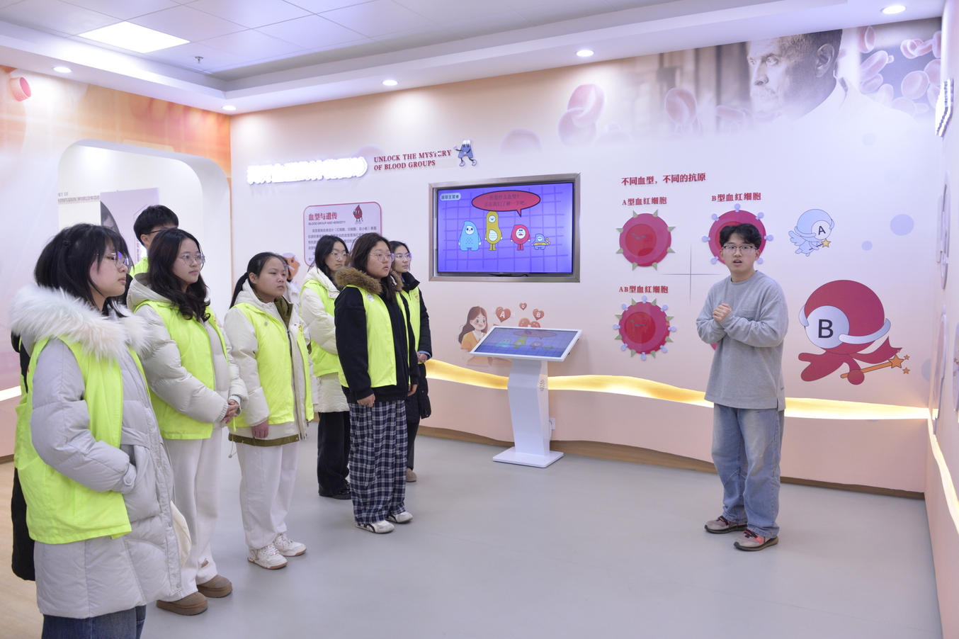 在无偿献血科普馆内,同学们通过丰富的图文展板、精细的血液模型和充满趣味的互动体验设备,系统了解了血液的生理奥秘、输血医学的发展历程、无偿献血的科学知识与政策法规。大家尤其对一袋血液从捐献者“血管”出发,历经采集、检测、分离、储存、运输,最终抵达患者“血管”的完整旅程,有了清晰而直观的理解。血站工作人员在现场细致解答各类疑问,让同学们对关乎献血者和用血者生命安全的严格操作有了更深入的认识。