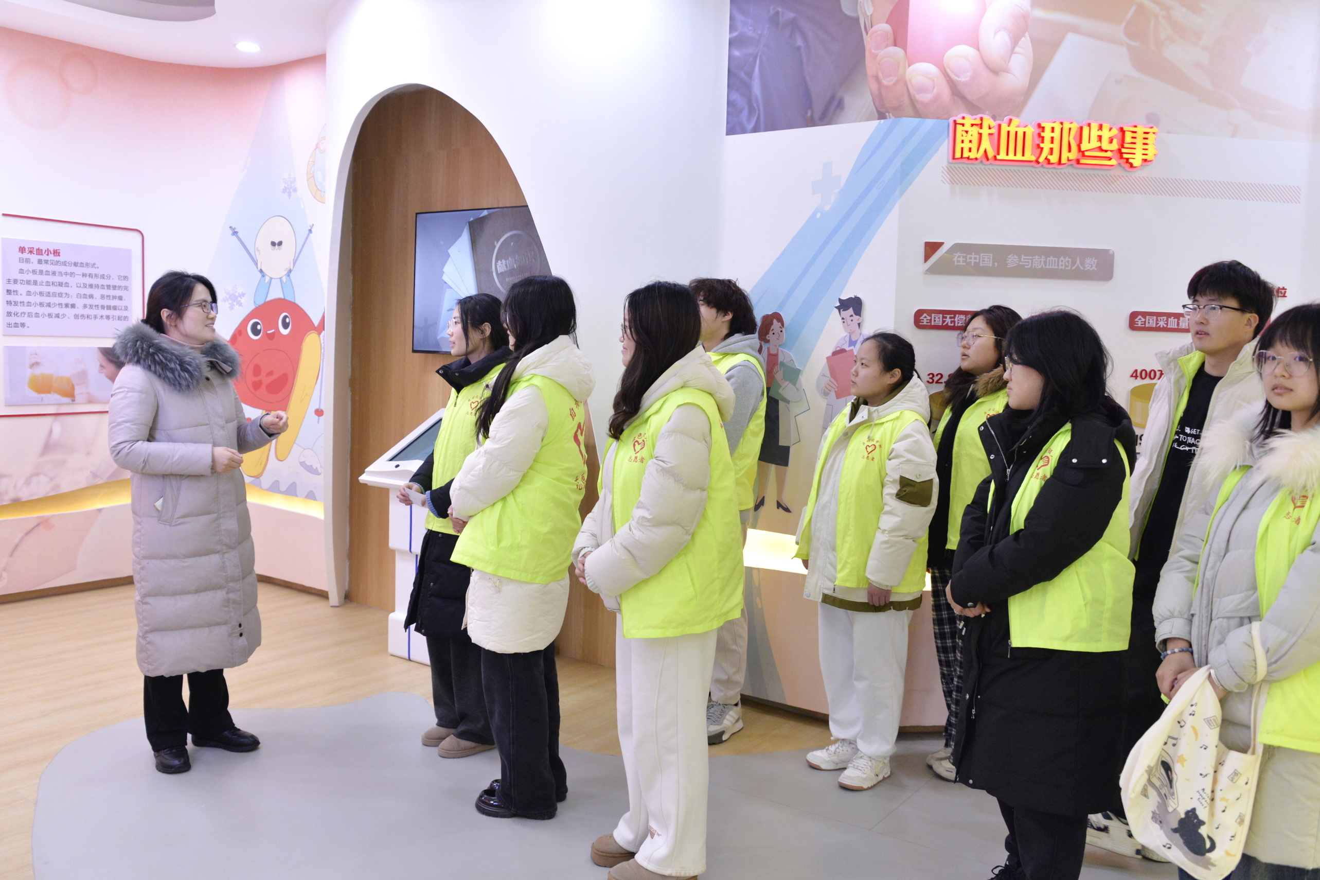 座谈环节,市中心血站副站长左群对同学们的到来表示热烈欢迎,并简要介绍了我市采供血情况及驻淮高校大学生参与无偿献血情况,讲解了无偿献血者的各项权益保障。并发出热情邀约:鼓励大家积极报名成为科普馆的志愿讲解员,将血液知识带回校园、带进班级,成为无偿献血事业的传播者。同学们对此积极响应,表示将利用寒假时间,在各自班级中梳理统计愿意参与无偿献血志愿服务的同学名单,并初步规划行动——淮安本地的同学可在寒假期间先行组织线下志愿服务活动,其他同学也将于春季开学后,在校内组织开展主题宣传与志愿服务。