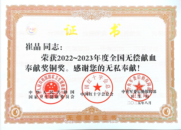 近日,国家卫生健康委、中国红十字会总会、中央军委后勤保障部卫生局联合发布《关于表彰2022—2023年度全国无偿献血表彰奖励获奖者的决定》,淄博市中心血站王廷库、崔晶、孔建三位同志凭借多年来对无偿献血事业的执着坚守与无私奉献,收获了这份国家级荣誉。