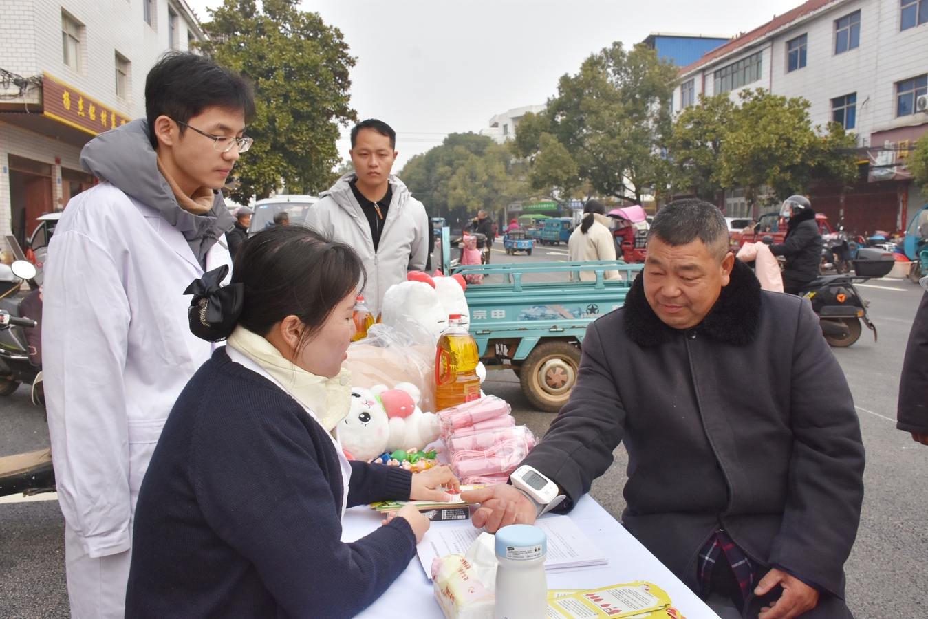 献血活动正式开始前,血站工作人员在前坊镇的集市设置了献血知识宣传点,向市民发放宣传资料并耐心讲解献血知识,还为前来咨询的居民测血压,给出健康建议,为后续献血活动营造了良好氛围。