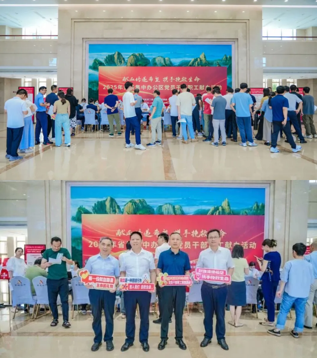 2025年7月24日,组织开展“献血传递希望 携手挽救生命”--2025年省级集中办公区党员干部职工集中献血活动。活动由省直机关工委、省卫生健康委、省机关事务管理局联合主办,省直机关工会工委、省血液中心、省机关事务管理局办公区服务中心承办,相关厅局领导到活动现场慰问献血者。现场500余名党员干部职工积极参与,最终成功献血11万余毫升。