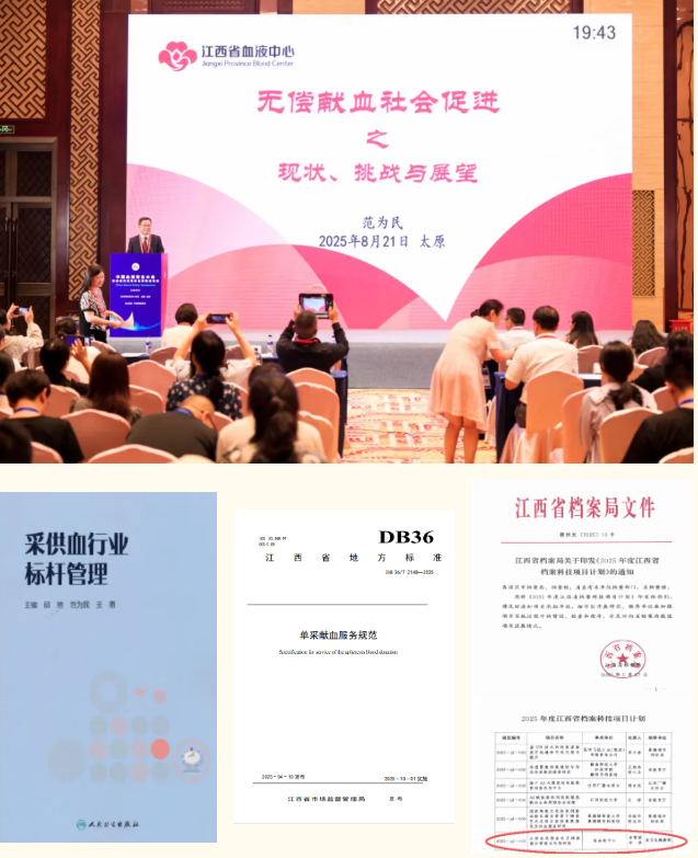 江西省血液中心在全国及全省采供血行业的学术影响力稳定上升。中心参与主编的《采供血行业标杆管理》由人民卫生出版社9月正式发行。在2025年中国血液安全大会上,中心主任范为民受邀做专题报告、2人进行大会口头发言并有1人获得十佳最受欢迎的口头报告、展出了14篇壁报,此外在其他全国性、全省性学术会议上10余人次进行授课、报告及交流发言。中心牵头制定的全省采供血行业唯一的地方标准《单采献血服务规范》已于4月发布、10月开始实施。首次获得1项江西省档案科技项目立项。圆满完成第二届并按计划开展第三届输血医学本科教育教学。