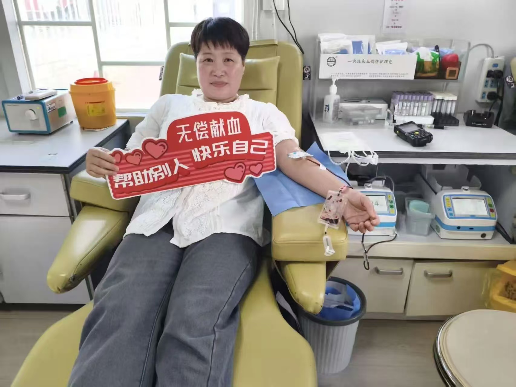 RhD阴性血献血者韩学琴当时正在菜市场买菜,接到宗爱玲队长的电话后,只回了一句:“我马上到!”拎着菜,一路小跑冲向华南献血屋,捐献全血400毫升。