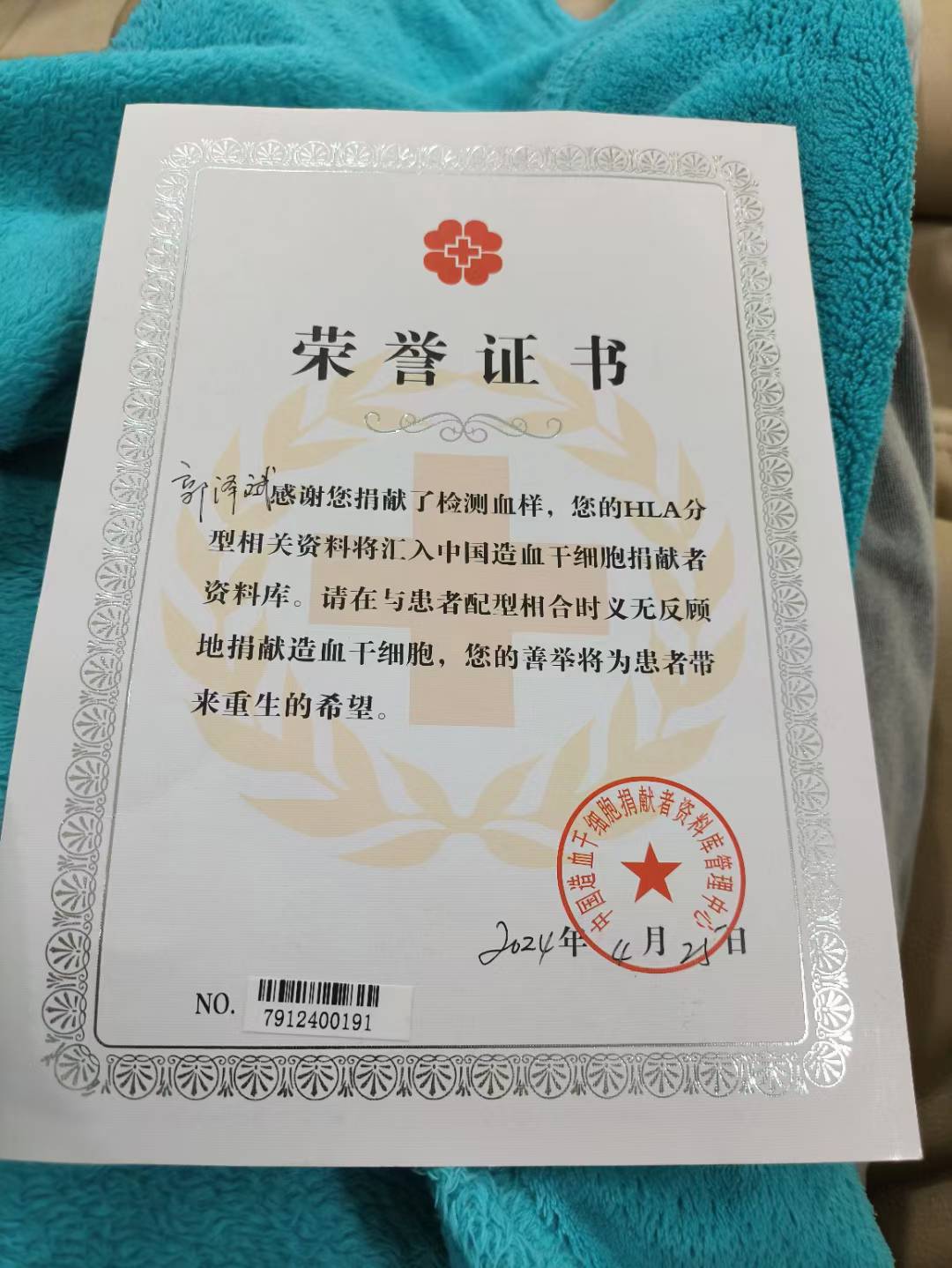 郭泽斌展示的捐献造血干细胞荣誉证书