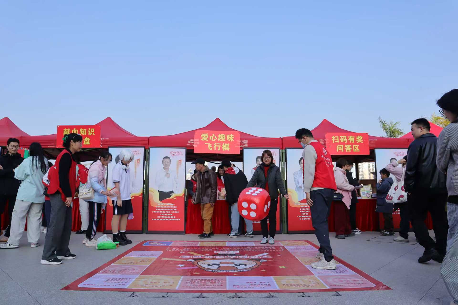 当天现场还开展了“热血迎新·爱满八桂”无偿献血者交流活动。为增强活动的科普性与互动性,现场还设置了“趣味大转盘”“问答飞行棋”等趣味游戏,吸引了大量市民驻足参与。展区前人头攒动,现场气氛热烈。无偿献血志愿者向前来参与活动的市民群众科普血液常识、无偿献血、《南宁市献血条例》等相关知识。在轻松愉悦的氛围中,传递“无偿献血,向上向善”的公益理念。在当天组织的采血车前,爱心市民也踊跃排队、挽袖献血,用行动诠释无私奉献精神。