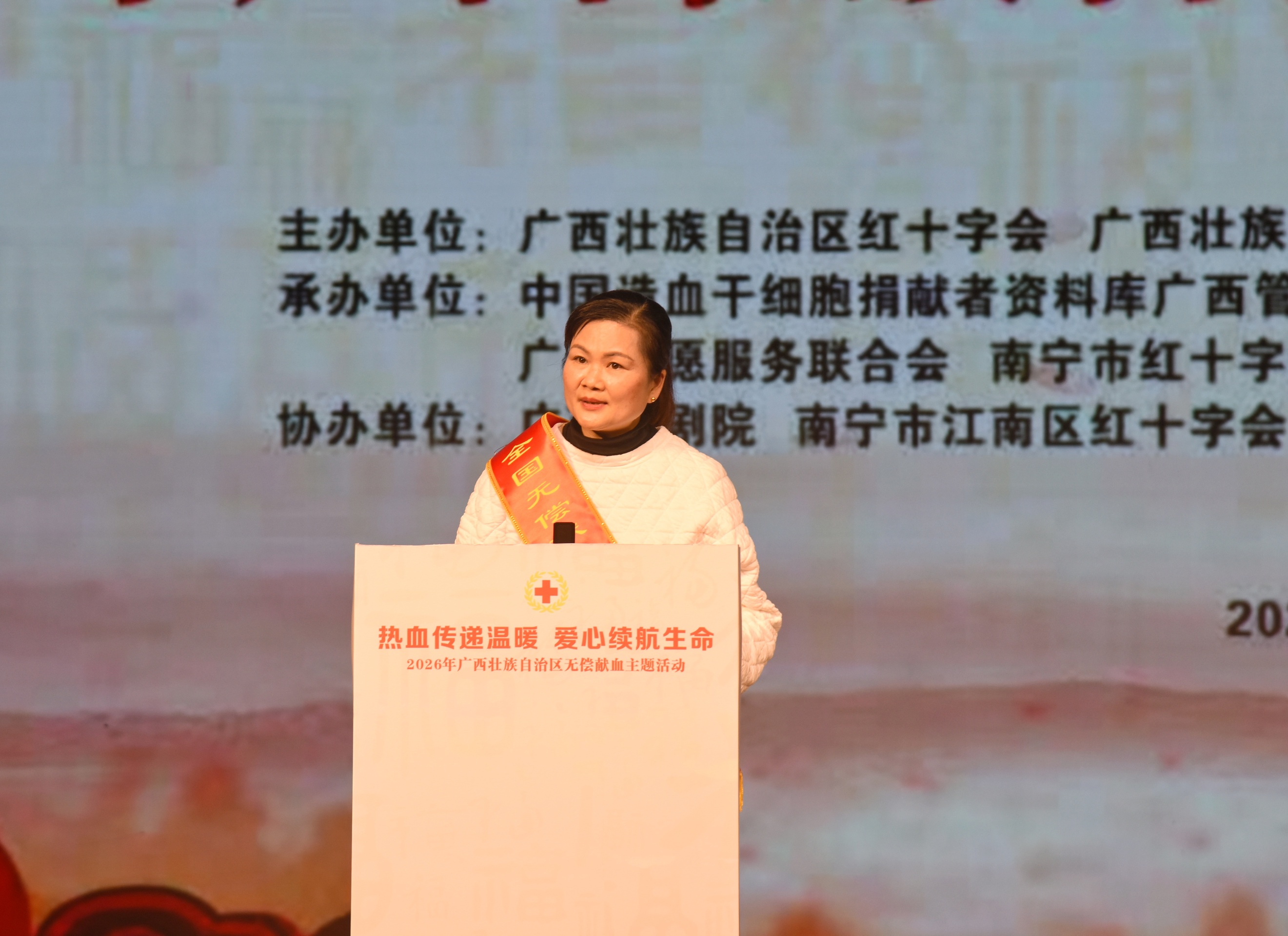 1月31日,由自治区红十字会、自治区党委社会工作部、自治区卫生健康委员会联合主办的“热血传递温暖,爱心续航生命”2026年广西壮族自治区无偿献血主题活动在广西民族剧院隆重举行。南宁中心血站作为承办单位一员,以多样化的活动形式与丰富的内容安排,为无偿献血者、志愿者及广大市民呈现了一场集公益传递、荣誉表彰、文化传播于一体的爱心盛宴。