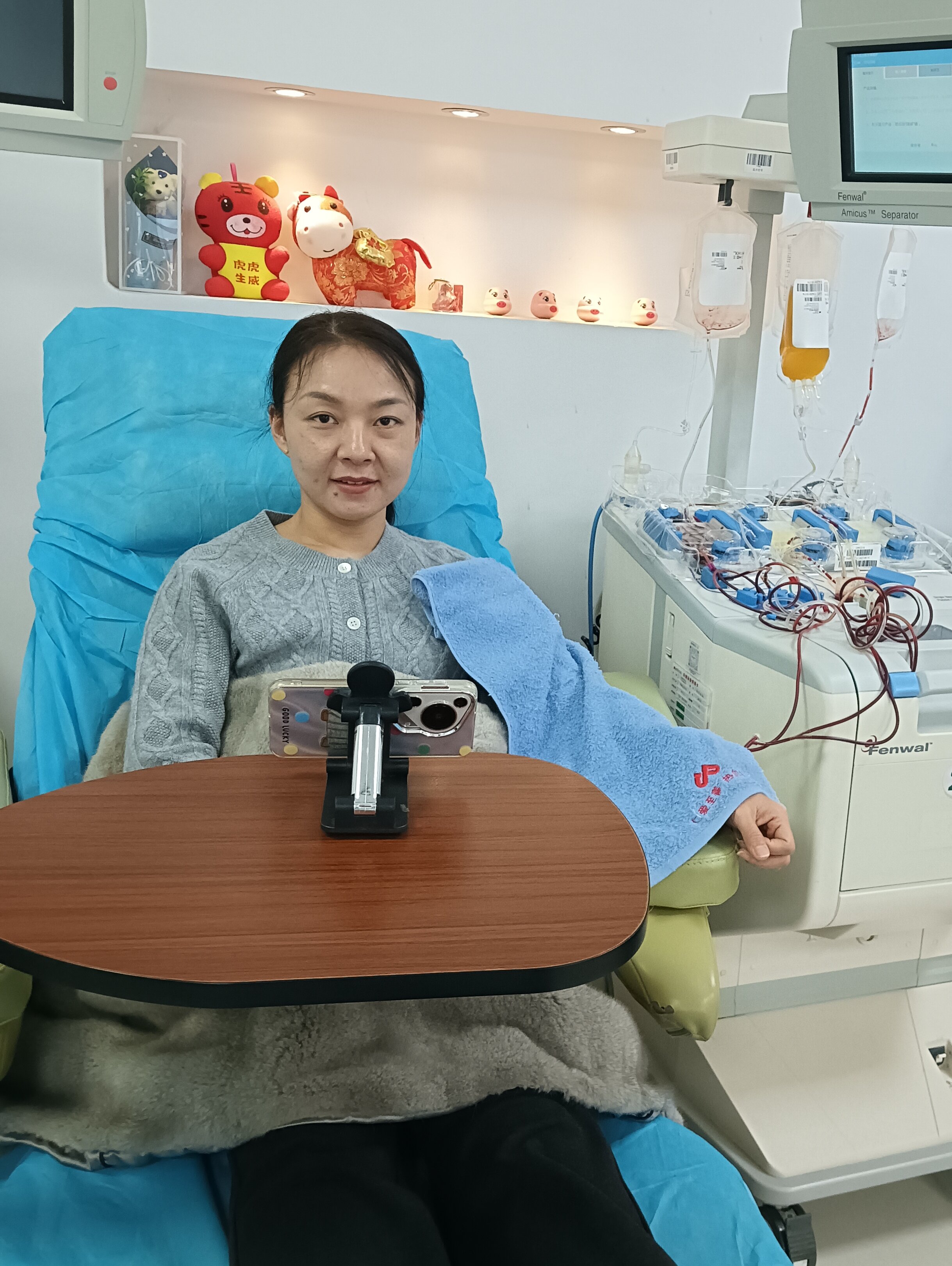 于洋身形纤瘦,按照献血标准,每次只能捐献一个治疗量的血小板。在她看来,献血从不是“量”的比拼,而是“心”的坚守,她早已将这份定期捐献,化作融入生活的习惯,更是对生命的郑重承诺。当针头轻柔刺入血管,鲜红的血液缓缓流向血细胞分离机时,于洋从容拿出手机,点开了视频会议软件——一场预订好的工作会议即将召开。“既然两个事项能协调进行,更充实些,献血、工作两不误。”她笑着解释道。在血小板采集的近一个小时里,机器低柔的运转声与视频会议的交流声交织,她一边耐心配合采集,一边专注参与工作讨论,用高效的行动诠释着医者的责任与担当。