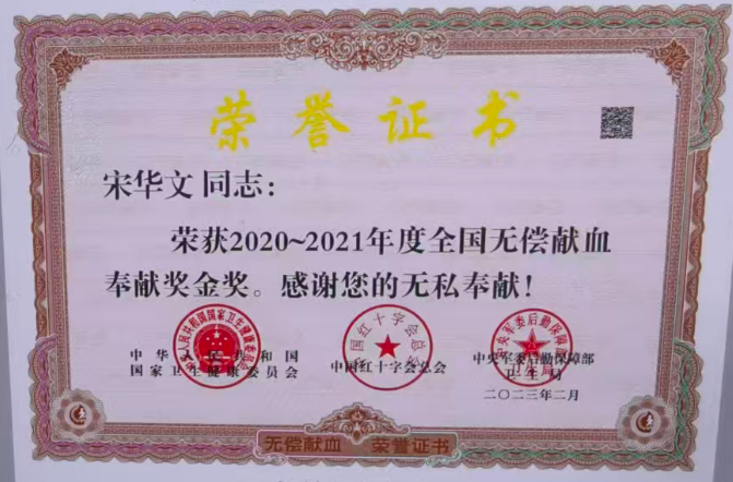 如今,宋华文年满60岁,正式结束了采血车驾驶员的职业生涯,无偿献血也因年龄限制按下了暂停键。有人问他,献了20年血,现在不能献了,会不会觉得遗憾?宋华文笑着回答:“当然不会,我已经完成了自己的目标。现在我虽然不能献血了,但我可以作为无偿献血宣传员,让更多人了解献血,参与献血,这也是在为救人做贡献。只要有人愿意听,我就会一直讲下去。”