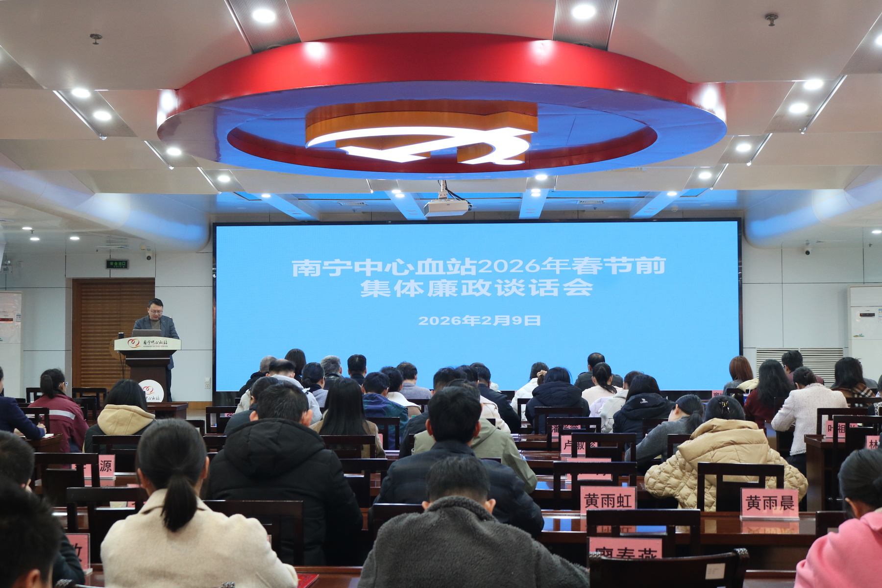 为持续深入落实中央八项规定精神,进一步严明纪律规矩,营造廉洁祥和、风清气正的节日氛围,2月9日,南宁中心血站召开2026年春节前集体廉政谈话会。党委书记、站长苏常山作集体廉政谈话,党委委员、副站长詹铁兵主持会议,班子领导及全体干部职工参加会议。