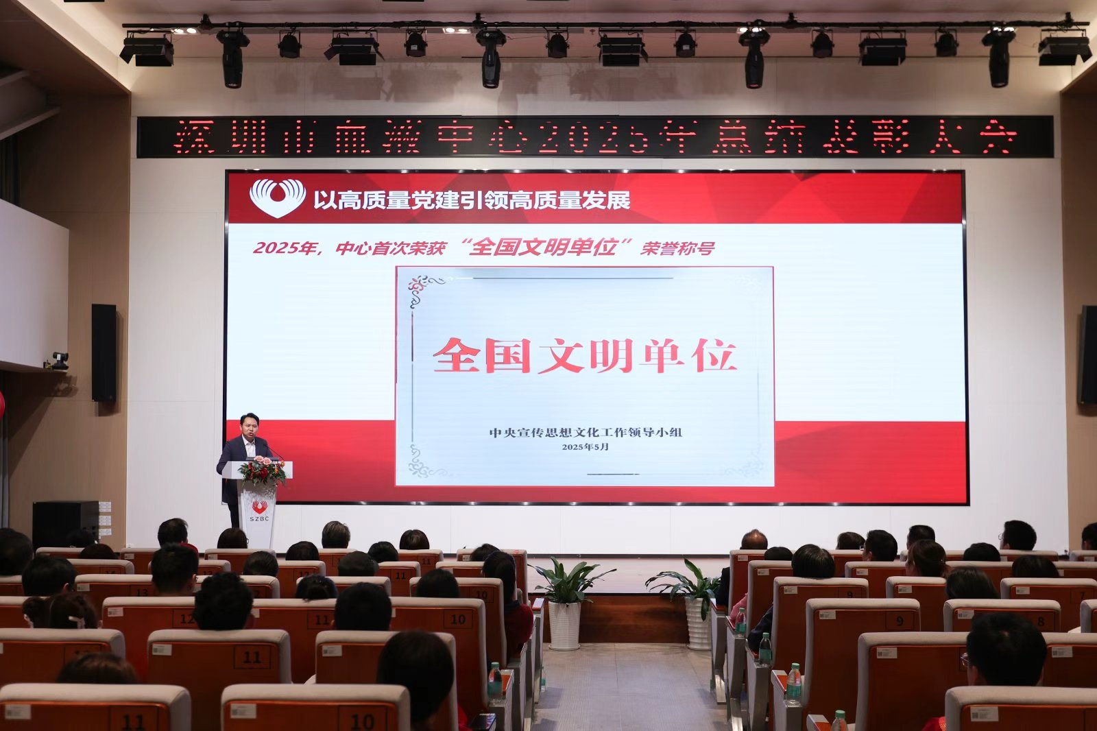 在随后的表彰会上,中心副主任刘晋洪宣读了表彰文件。号召全体员工以先进为榜样,立足岗位、积极工作、奋勇争先,为共同推动深圳血液事业高质量发展,加快建设先行示范、国际一流血液中心贡献力量。