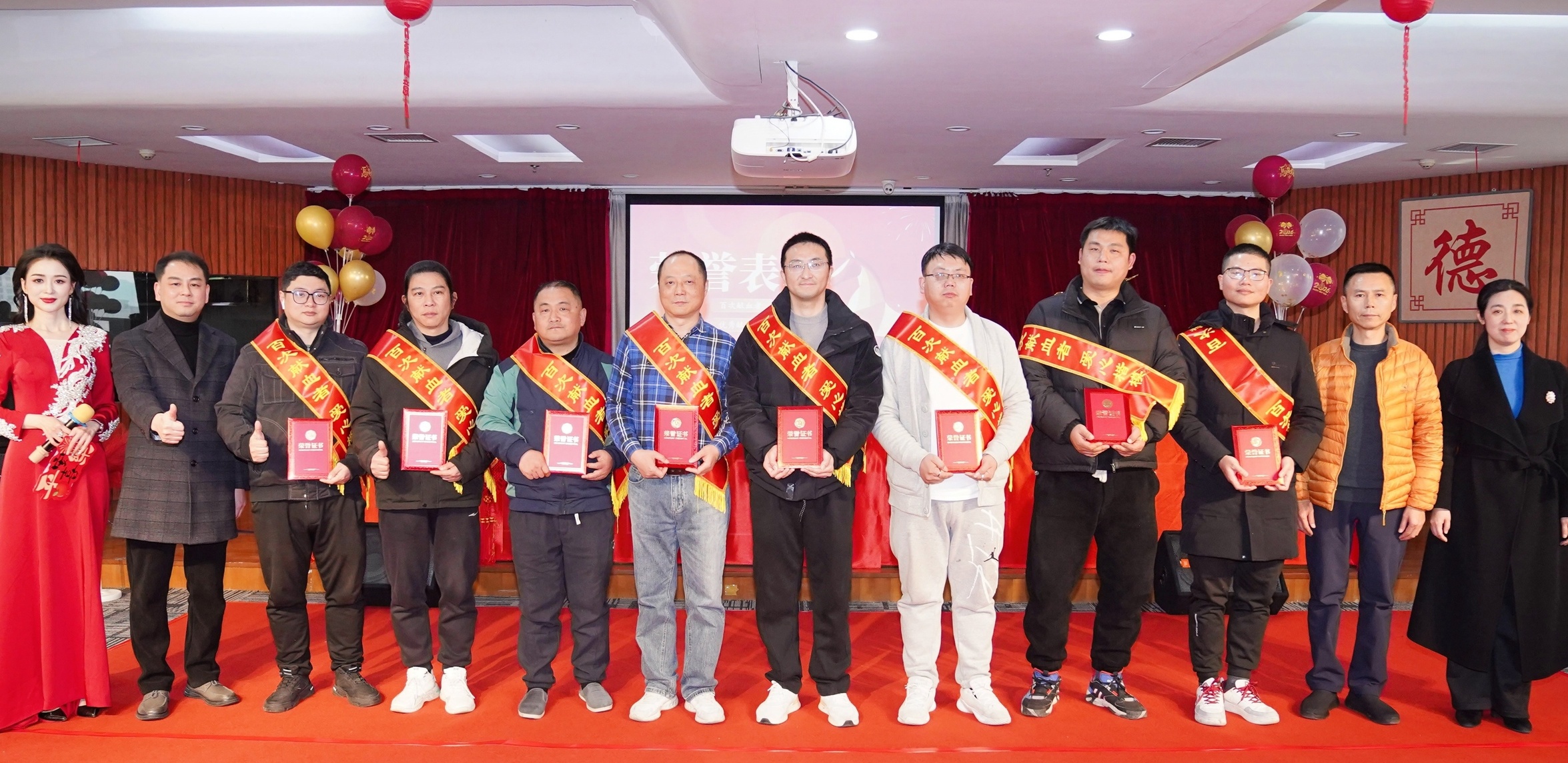 感恩会进入最隆重的表彰环节,南昌市中心血站站长钱献、副站长王园华、姜珍一依次为百次献血者、2025年优秀献血者代表颁发发荣誉证书并与他们逐一握手后合影留念。每一张荣誉证书,都是对献血者无私奉献的最高肯定,每一张合影,都定格了这份温暖与感恩。