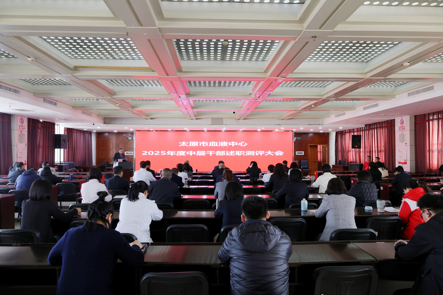 2026年1月28日,太原市血液中心召开2025年度中层干部述职测评会。会议按照精简高效的原则,听取了办公室等9个科室主任的现场述职报告,其他中层干部进行了书面述职。全体参会人员依据述职情况和日常表现,对中层干部进行了客观公正的民主测评。会议由中心副主任王卫东主持,中心领导班子成员、全体中层正副职干部及全体职工代表参加了会议。