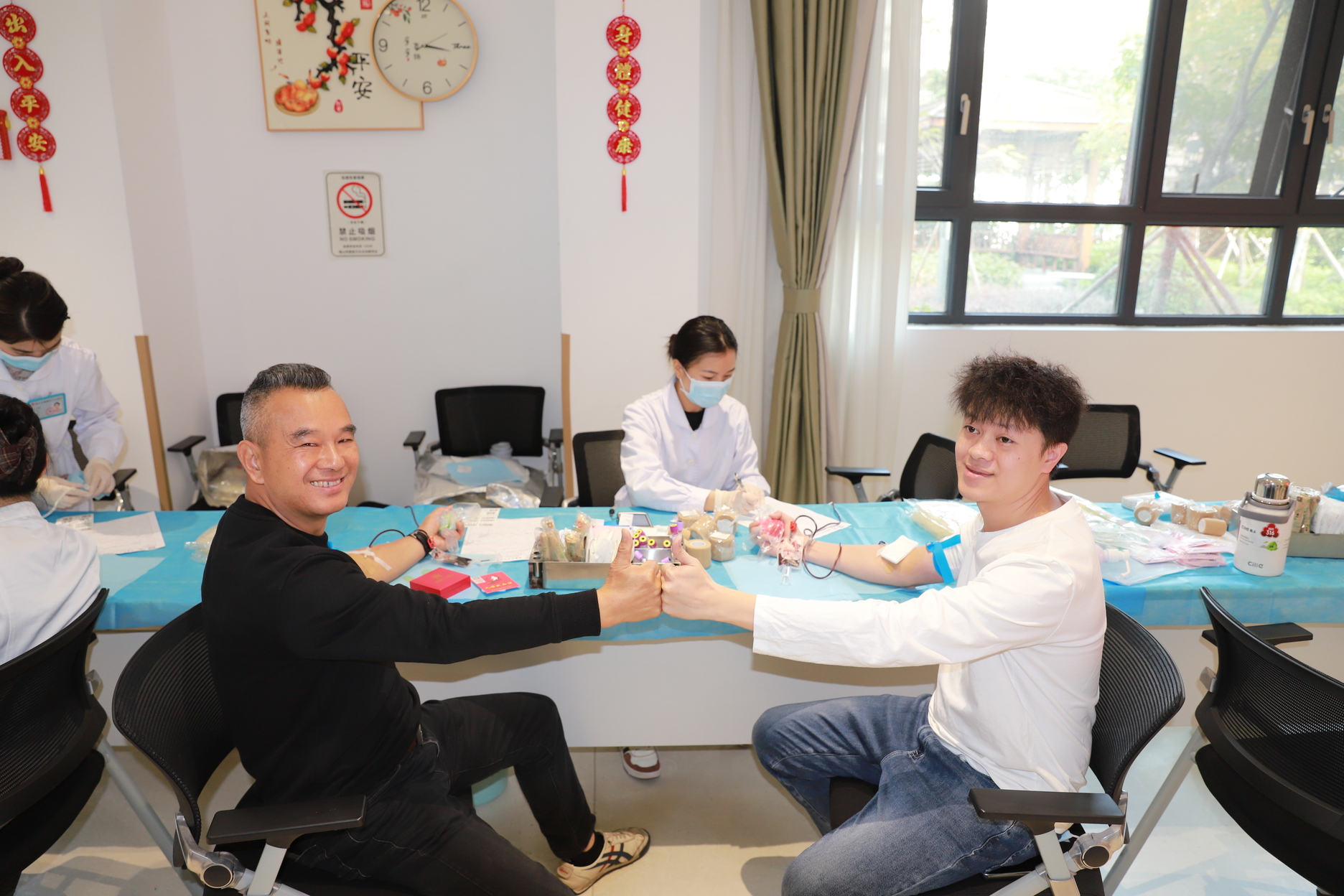 勒流健共体党委书记吴恩良,党委委员卢秀芬、杨树洧来到献血现场,慰问参与献血的员工。期间,卢秀芬、杨树洧两位委员主动挽袖,加入献血队伍。吴恩良书记强调,医院对本次献血活动高度重视,前期已全面部署、广泛动员,凝聚全院力量支持无偿献血工作。他表示,医务人员作为健康守护者,始终是无偿献血的“先锋队”和“宣传员”,应当以实际行动践行责任与担当。