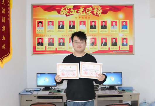 近日,虢奔来到咸阳市中心血站献血办,领取了父亲和自己的2022-2023年度全国无偿献血奉献奖。虢奔15次献血6000毫升,父亲也11次献血4400毫升。