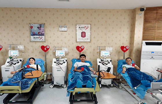 献血服务部毛亚带着孩子来到采血点开展志愿服务,并捐献血小板