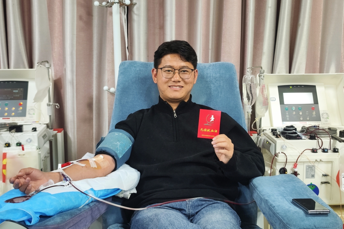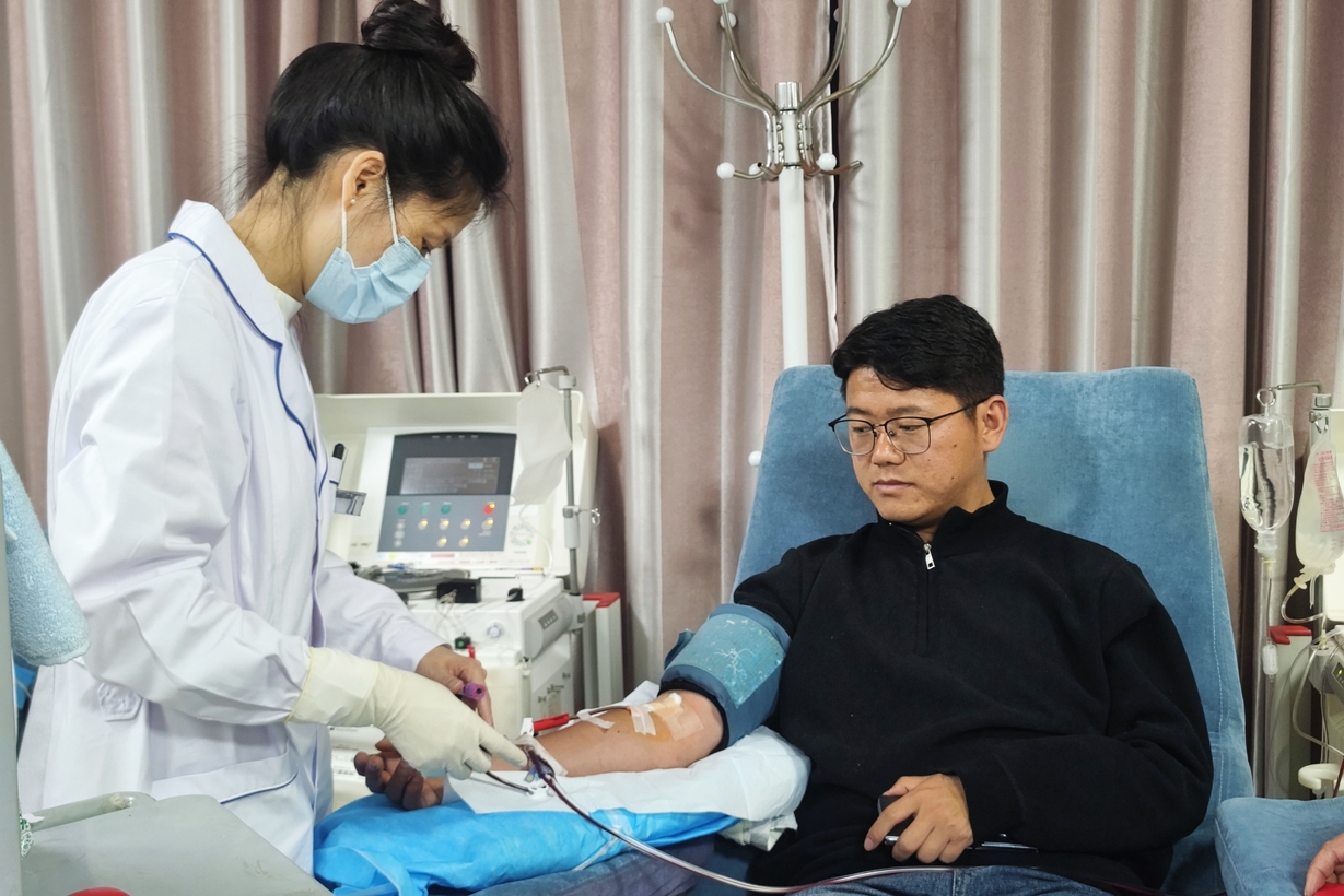 在血站内,仁青扎西认真填表、完成检查,成功捐献2治疗量的血小板,当年的心愿终成现实。鲜红的热血,承载着他的感恩与善意,让爱心在传递中生生不息。
